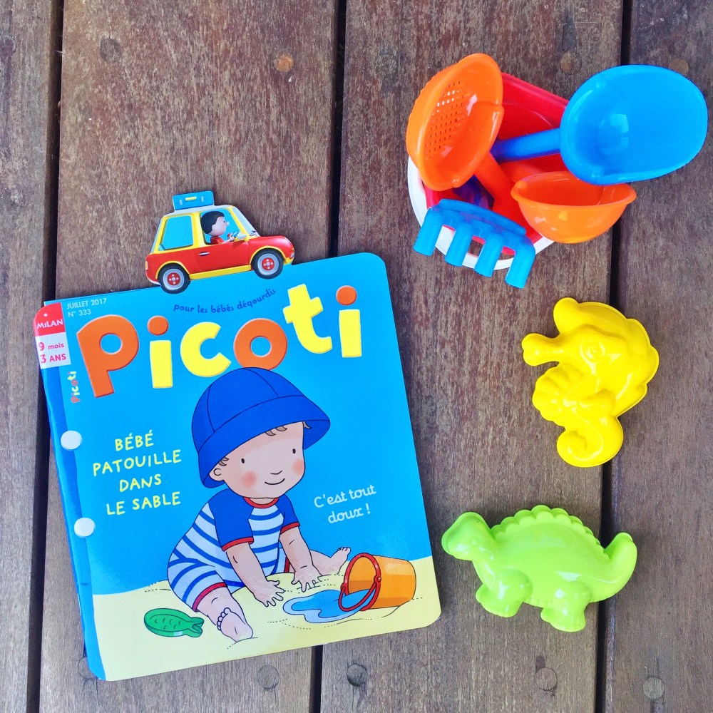 • PICOTI : Chez PICOTI destiné aux 9mois-3ans, on retrouve plus les dessins que l’on a l’habitude de voir. C’est un visuel moderne avec en couverture un petit garçon qui joue dans le sable avec sa pelle et son seau. Jade a d’ailleurs adoré le kit de plage fourni avec le magazine, c’est de loin le jouet qu’elle a préféré. Le petit moins et pourtant c’est ce qu’il considère comme la « La cerise sur le gâteau » sur leur site  : le dépassant conçu pour les mains de bébé ! Je peux vous assurer que Jade a bien pris en main la petite voiture qui dépasse ! En quelques minutes, elle a d’ailleurs décidé que cet appendice devait être déchiré !