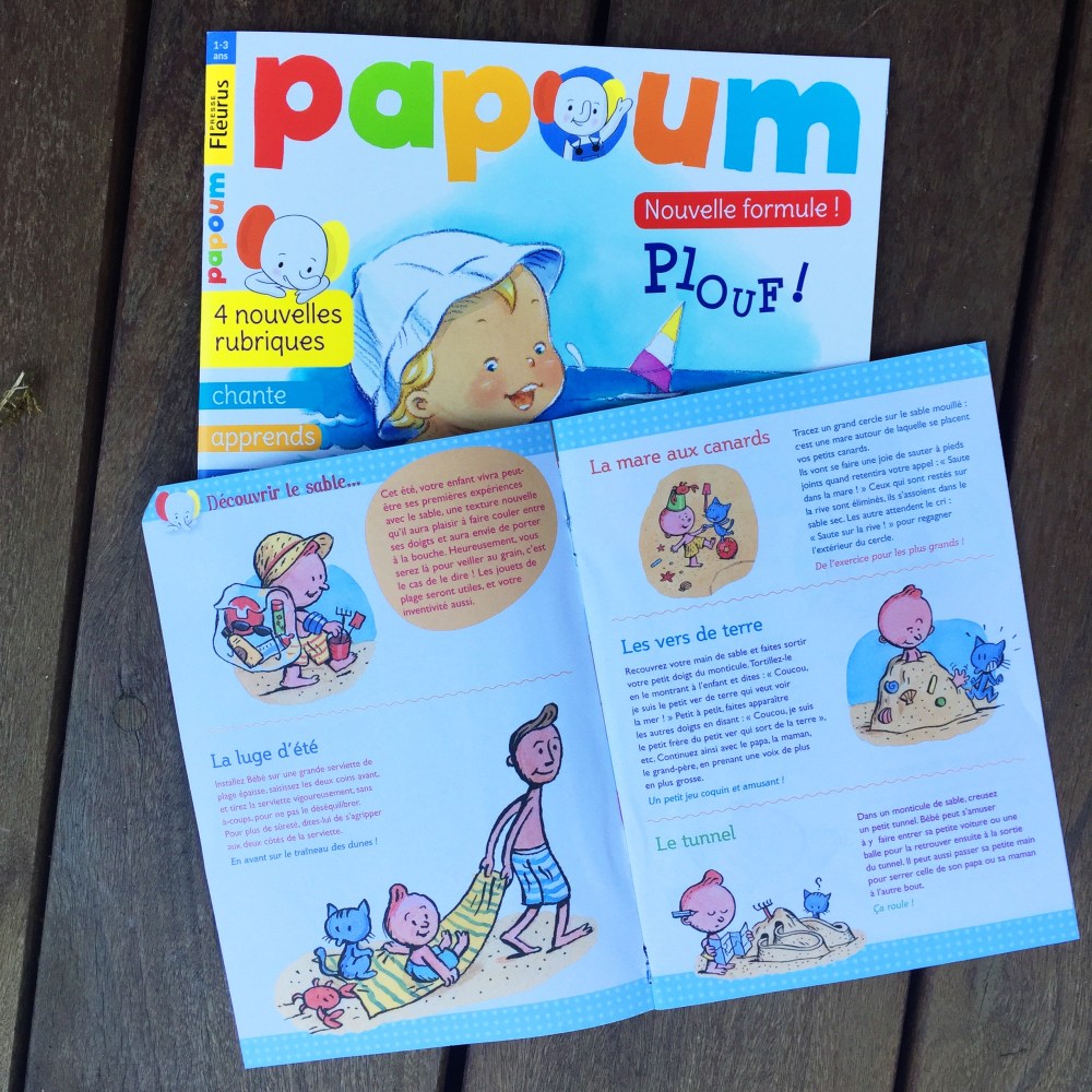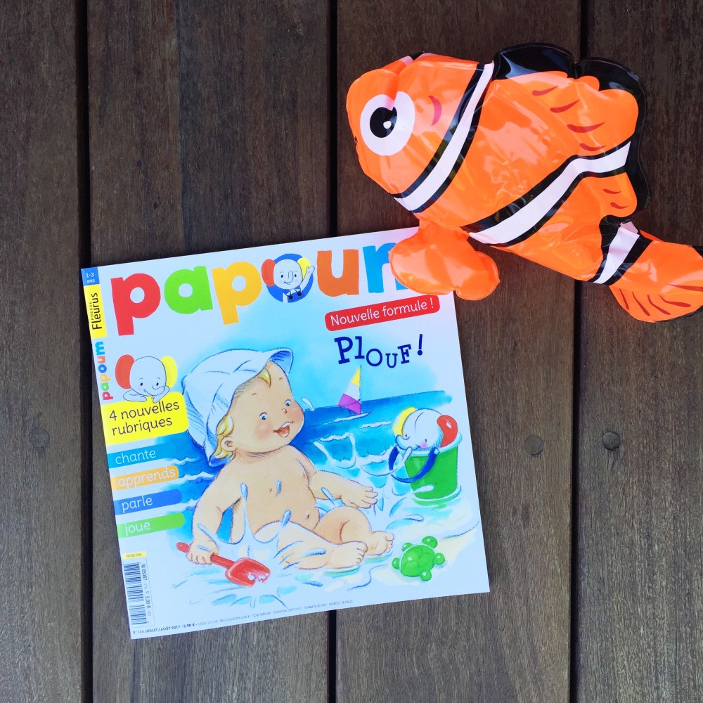 • PAPOUM : Concernant Papoum, il s’agit du magazine avec le plus grand format bien qu’il reste facile à glisser dans le sac à dos de nos bambins. Il est destiné au 1-3 ans et rien qu’avec la couverture, le ton est donné ! Juju (le petit garçon) et Papou (son doudou éléphant) sont dessinés dans des couleurs pastels, un style aquarelle qui se différencie tout de suite des deux autres. Juju et Papou sont sur la plage (été oblige) à jouer dans les vagues. Avec le magazine, un petit accessoire de plage est fourni. Nous avons eu le petit poisson clown gonflable mais un dauphin était également disponible.