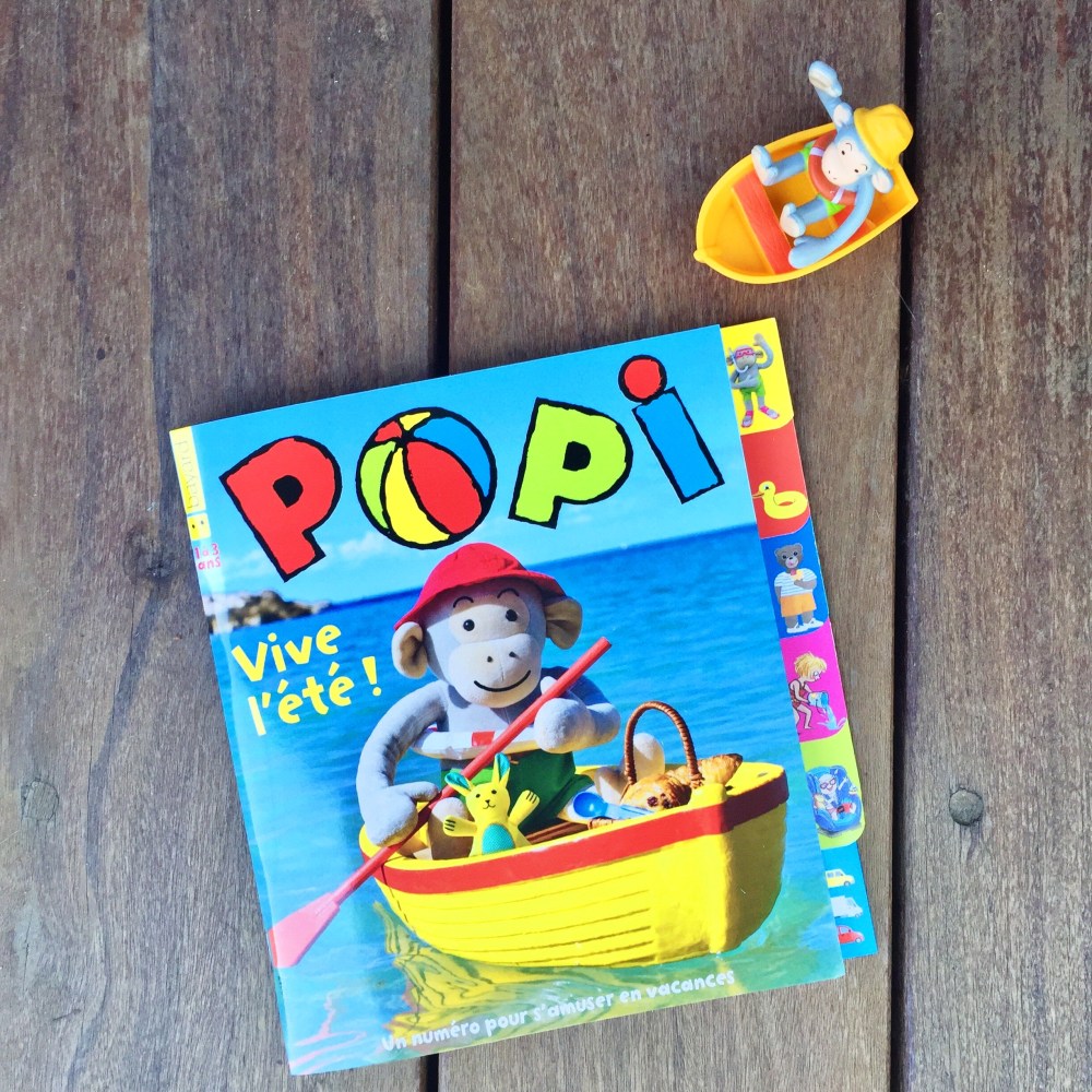 • POPI : C’est la version réaliste destinée aux 1-3 ans également! Popi, le petit singe, est une vraie peluche mis en situation dans de vrais décors. Ce n’est pas du dessin mais de la photo ! La couverture sent bon l’été, couleur flashy, Popi sur sa barque. D’ailleurs, c’est le cadeau proposé avec le magazine, une petite figurine de Popi dans son bateau. Les différentes sections du livre sont bien différenciées avec le système d’intercalaire, ce qui est très plaisant. Jade a d’ailleurs tout de suite repéré qu’il y avait son héros préféré à l’intérieur.
