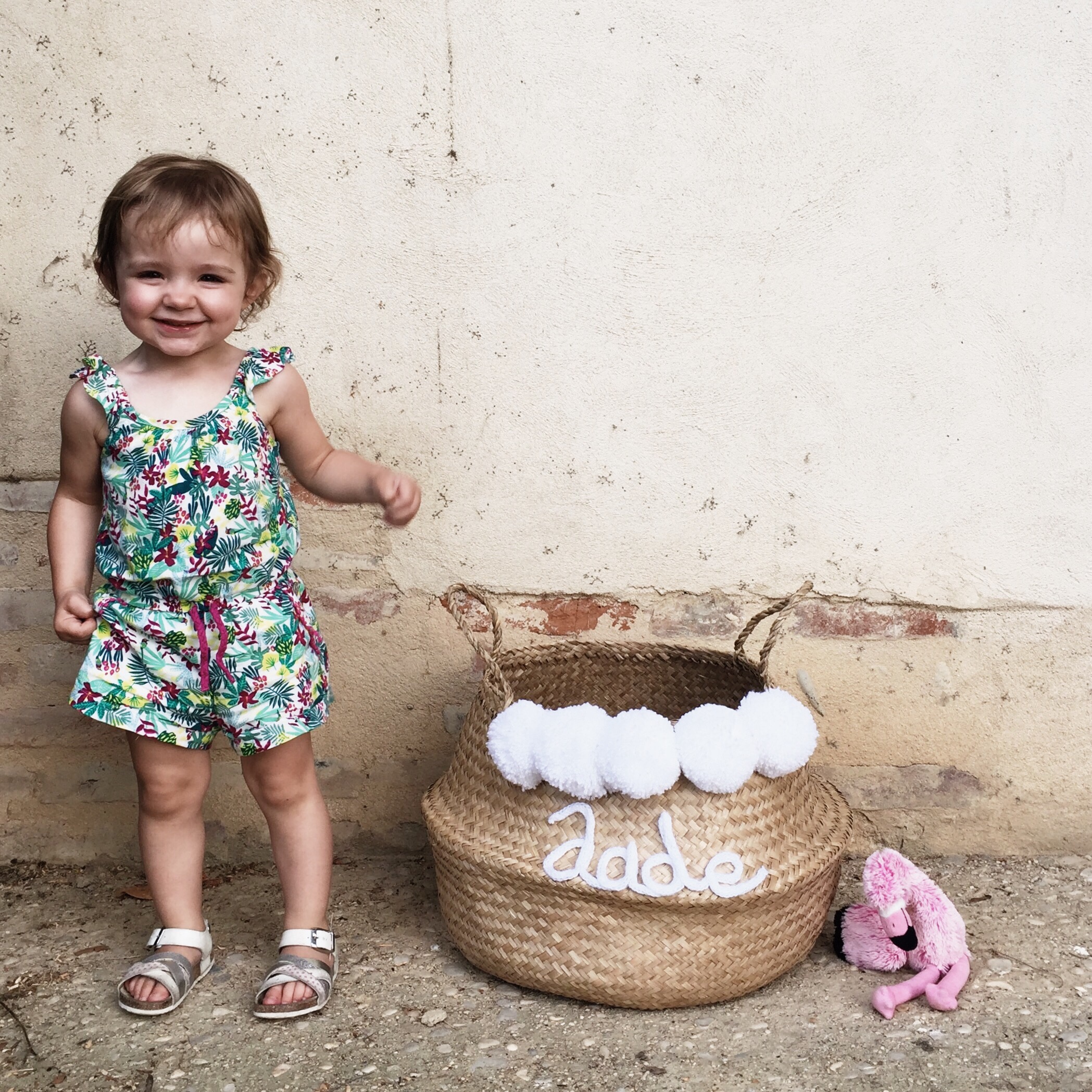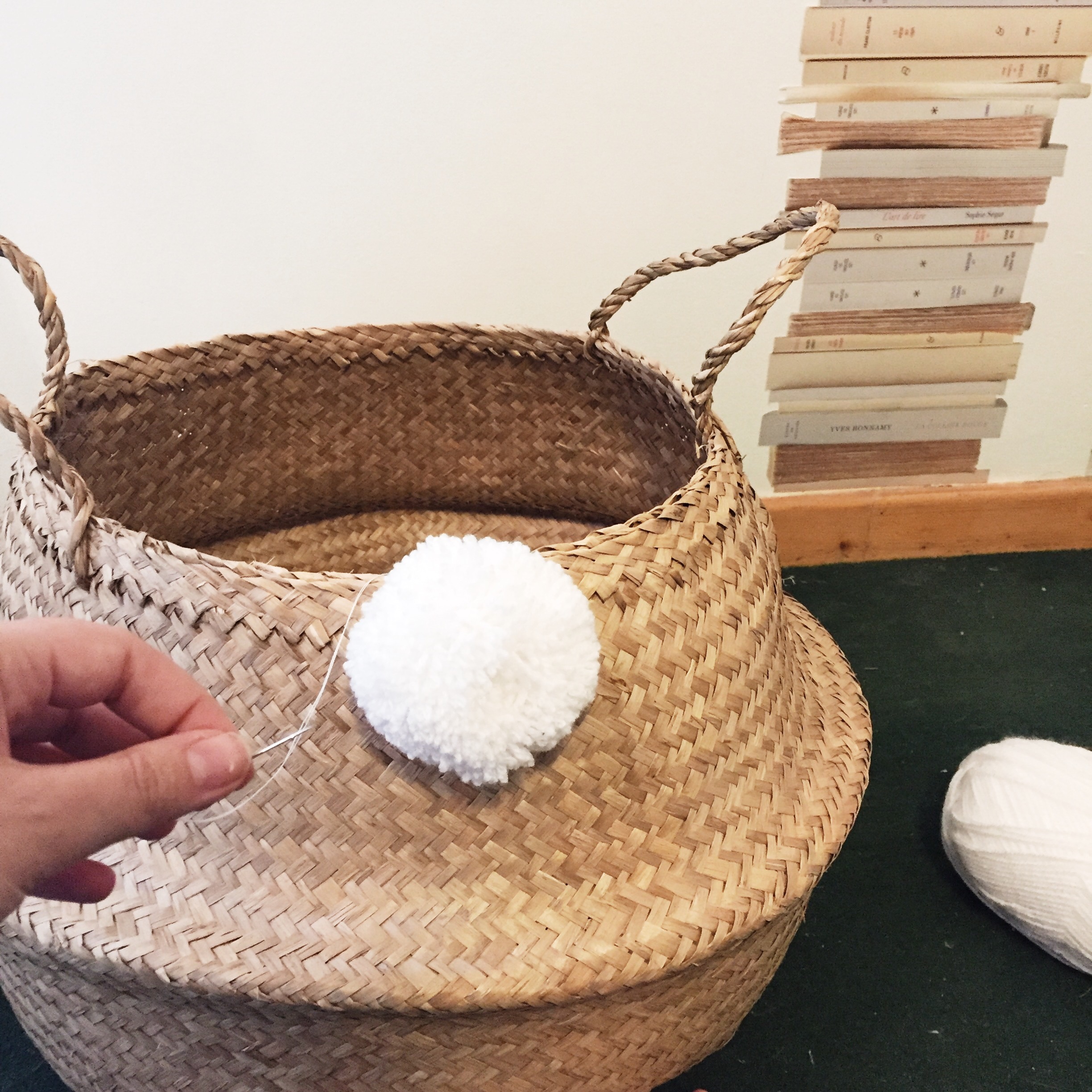 Concernant les pompons, j’ai choisi de fixer les 5 pompons de manière symétrique entre les deux anses du panier sur l’extrémité supérieur.