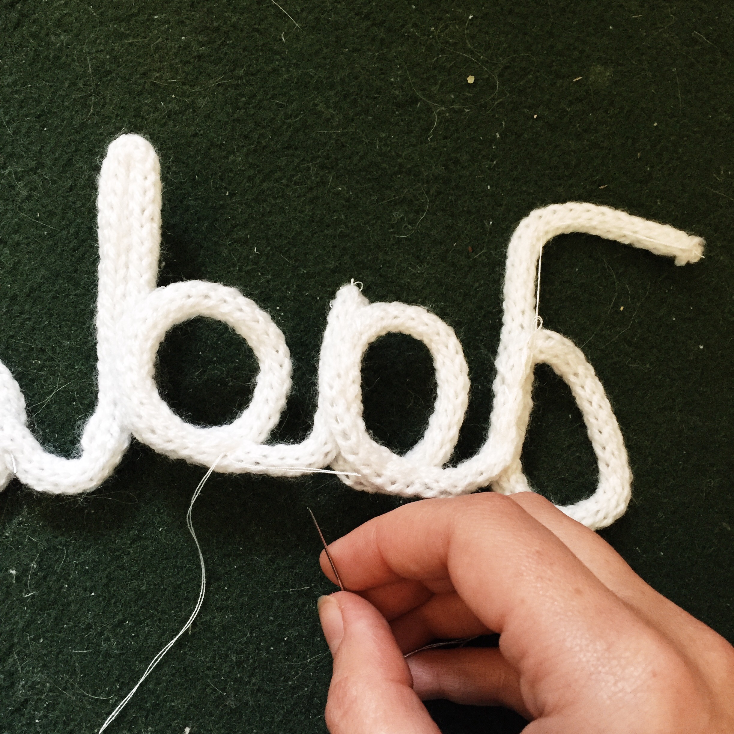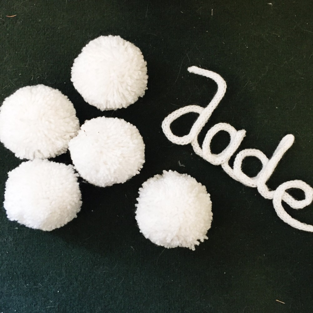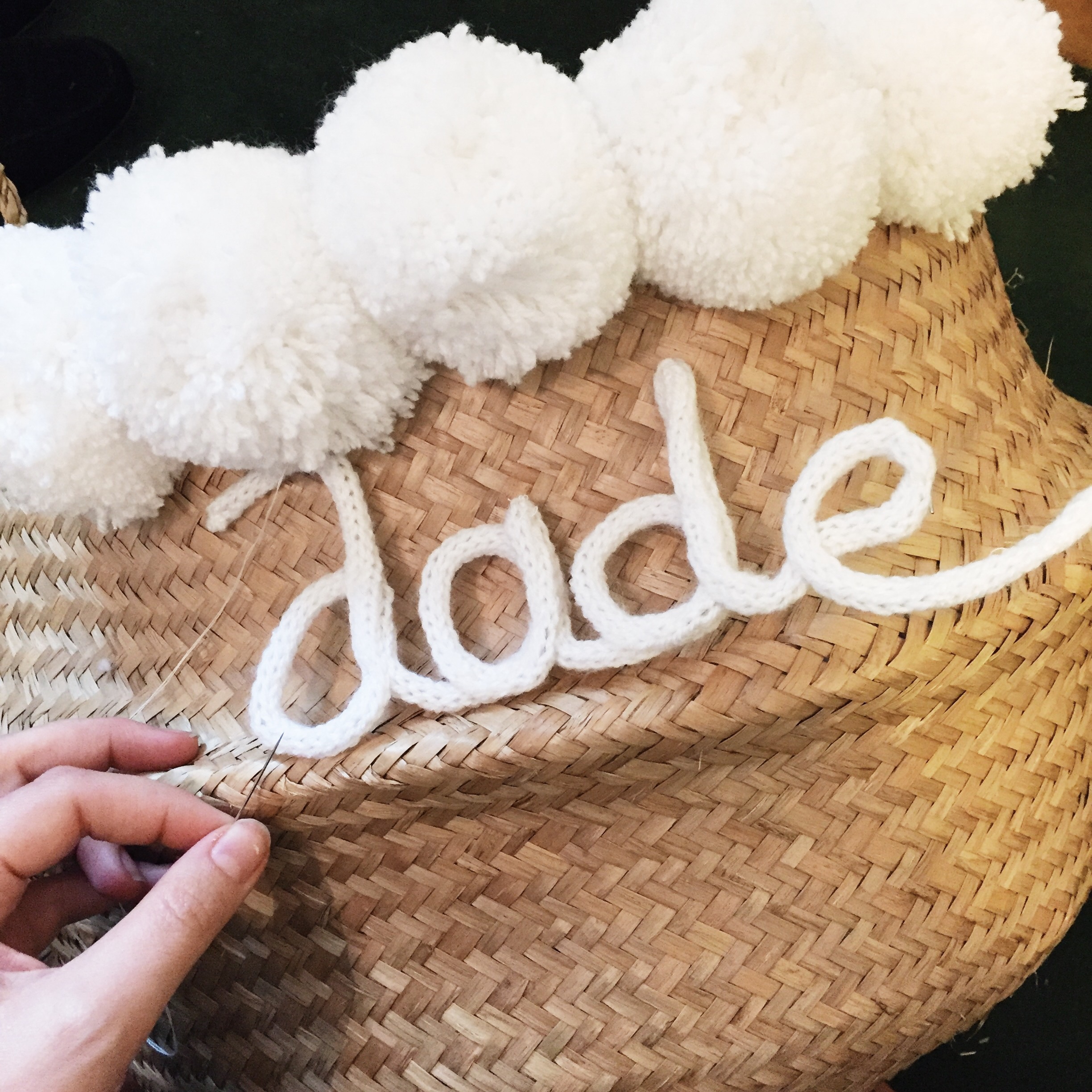 Puis de coudre le prénom tricotin juste en dessous des pompons sur la « pliure » du panier boule.