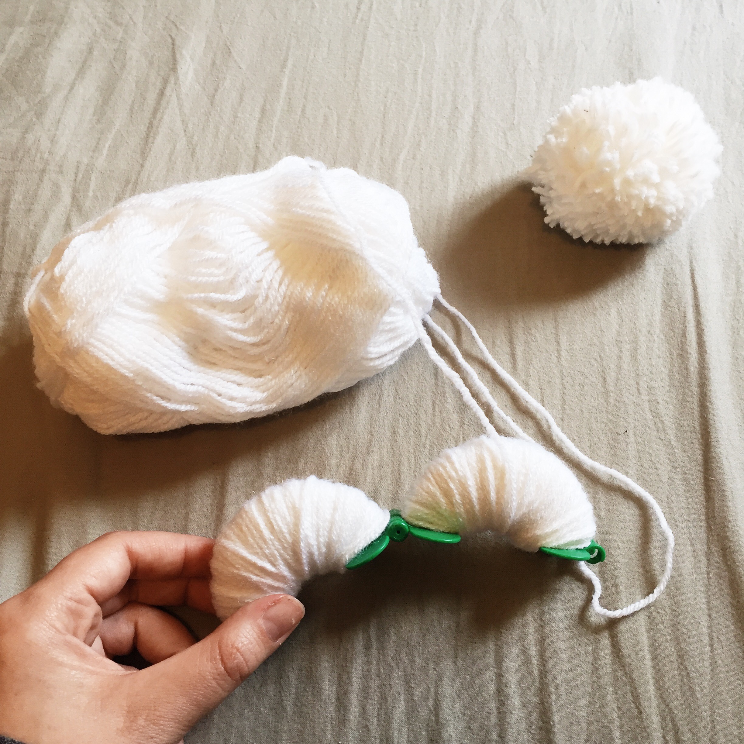 Et pour les pompons de suivre le DIY spécial pompons : https://marinelyon.com/2017/07/28/atelier-pompom/ Pour ce DIY j’ai fait 5 pompons de 5cm de diamètre.