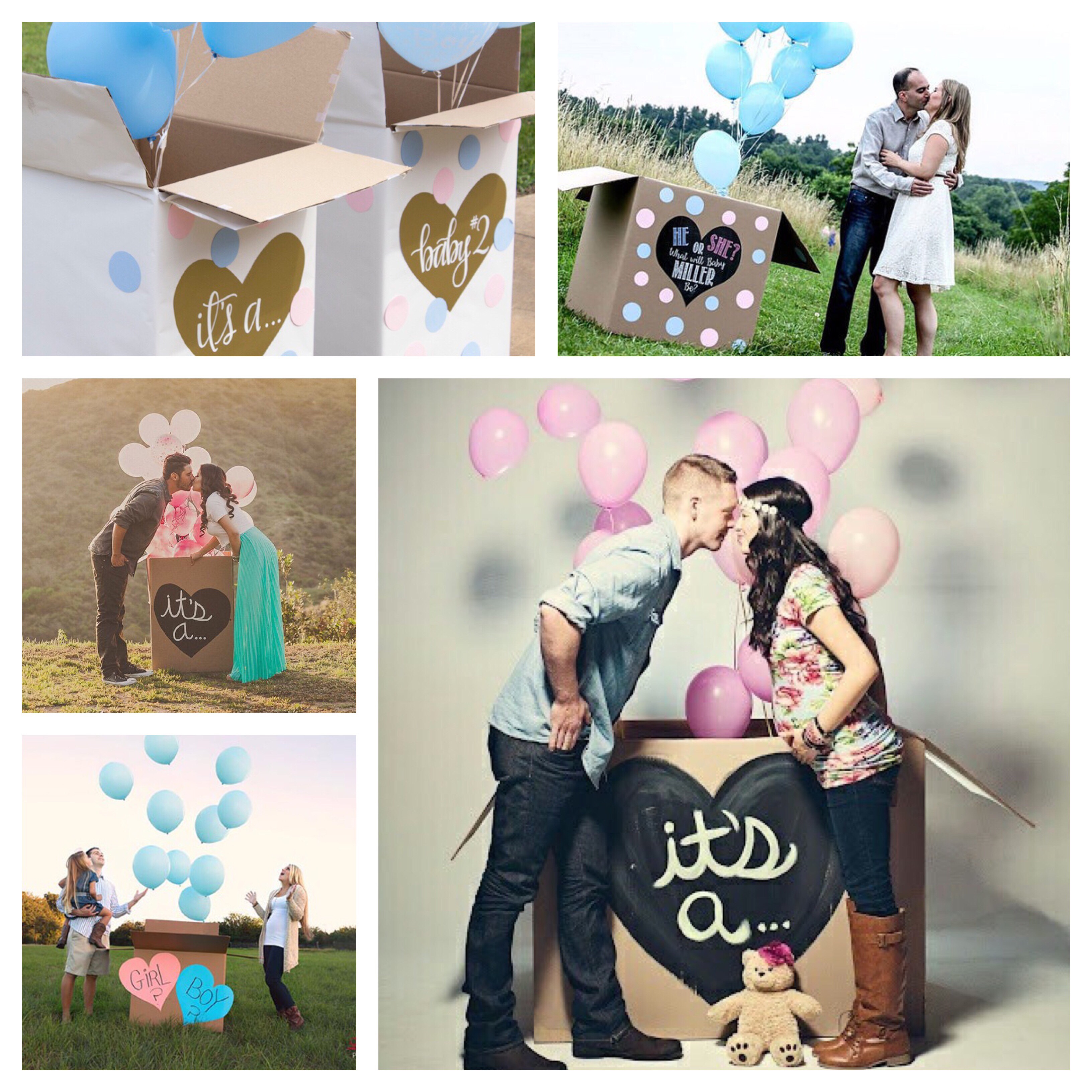 Assez traditionnel également et empli de poésie, le lâché de ballons à l’hélium est l’un de mes petits chouchous (mais j’ai beaucoup de chouchous). Enfermés dans une boite en carton joliment décorée, des ballons de la couleur du sexe du bébé et gonflés à l’hélium seront nichés à l’intérieur jusqu’à l’ouverture du carton par les futurs parents. Pour les mamans hermétiques à la distinction fille-garçon par la couleur rose-bleu, il est possible de trouver des ballons avec message « Je suis une fille », « je suis un garçon » !