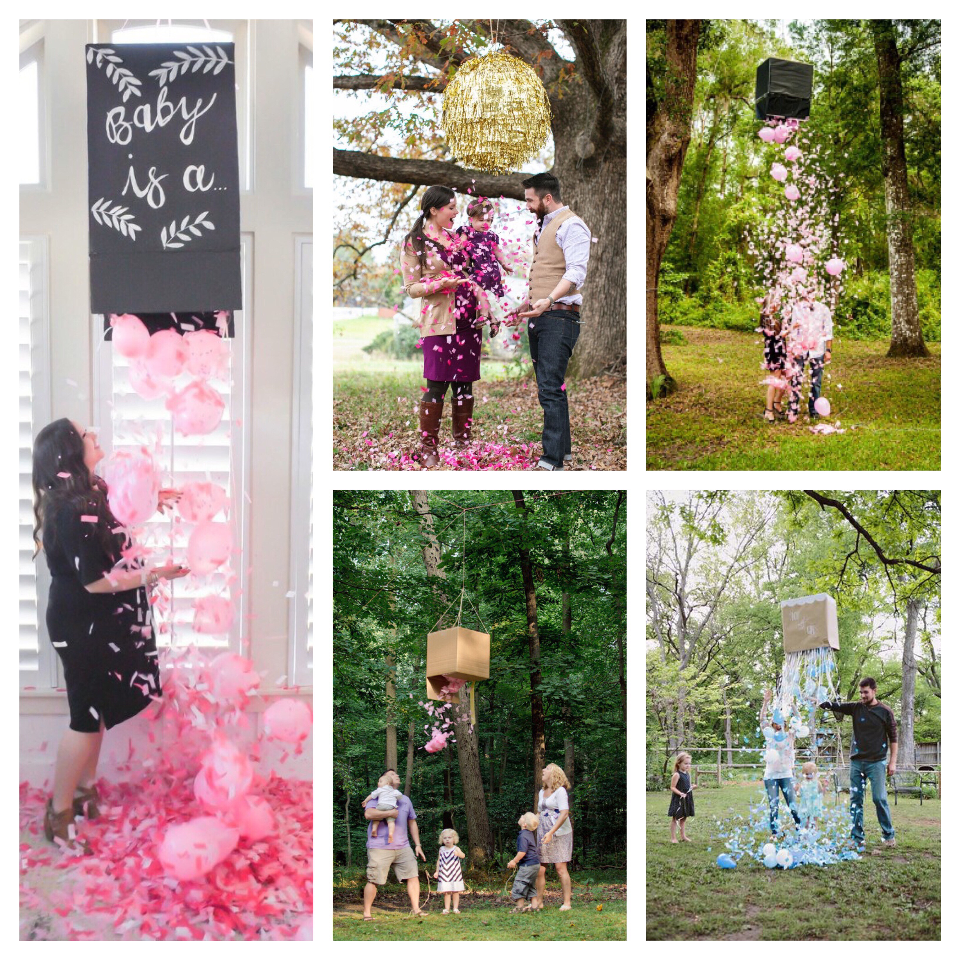 Pour rester dans les confettis ! Il s’agit finalement d’une piñata que l’on va venir remplir non pas de bonbons (quoique c’est possible !) mais de confettis de la couleur du sexe du bébé. Les futurs parents se positionnent sous la piñata , devant l’œil amusé du reste de la famille et actionnent la tirette (ou tape sur la piñata ) pour laisser tomber les confettis et dévoiler le sexe du bébé !
