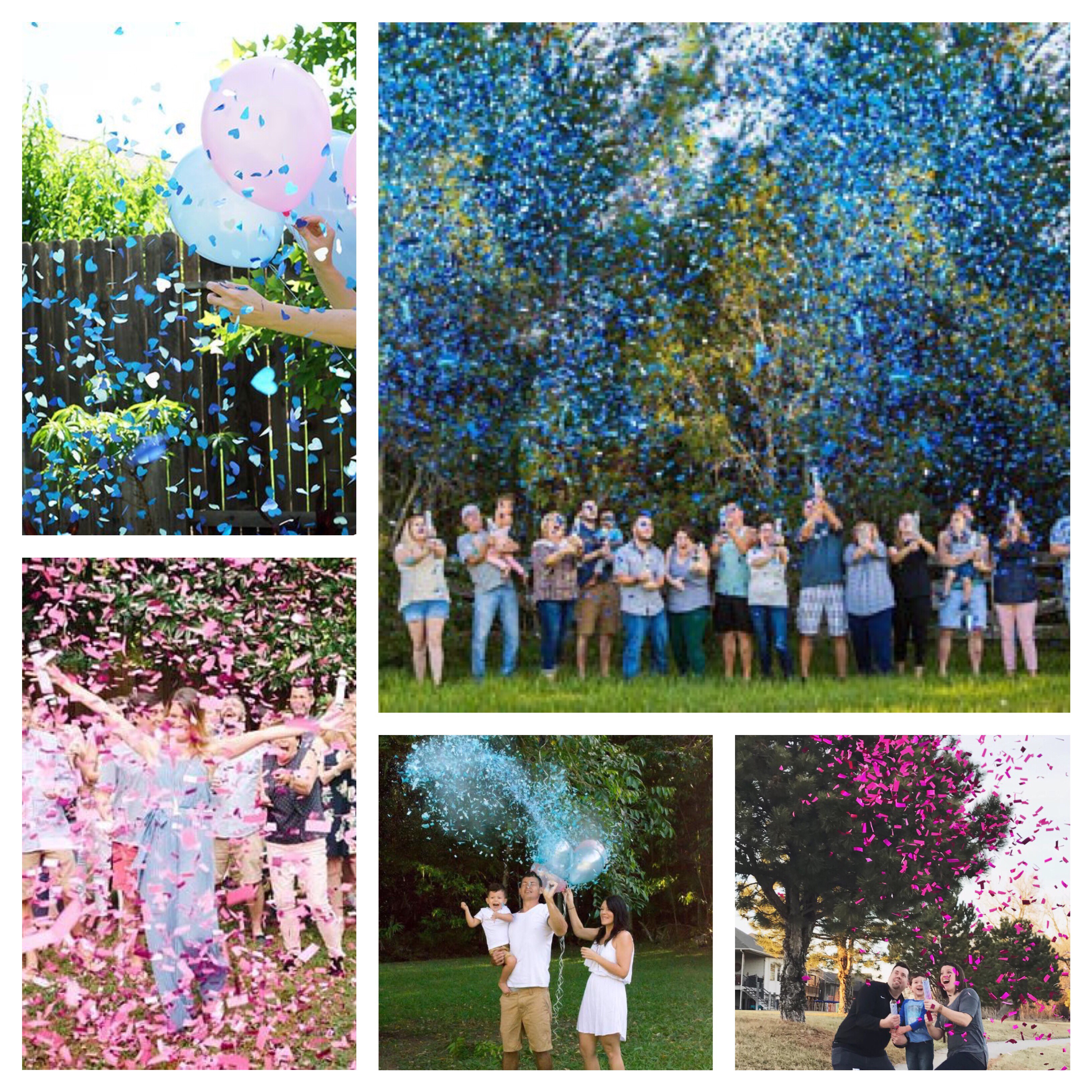 Si vous ne cragniez pas le bruit du ballon qui éclate alors je vous propose cette version du « Gender Reveal Balloon » ! En solo, en duo ou en famille (le rendu est superbe à plusieurs), le principe est d’avoir un ballon au dessus de sa tête que l’on vient exploser pour laisser tomber les confettis qui révèlent la couleur du sexe du bébé. En famille, l’idée est par exemple de donner un ballon gonflé à l’hélium à chaque membre de la famille, de faire un compte à rebours (en même temps que le compte à rebours du jour de l’an ? ) et d’exploser tous en même temps son ballon !