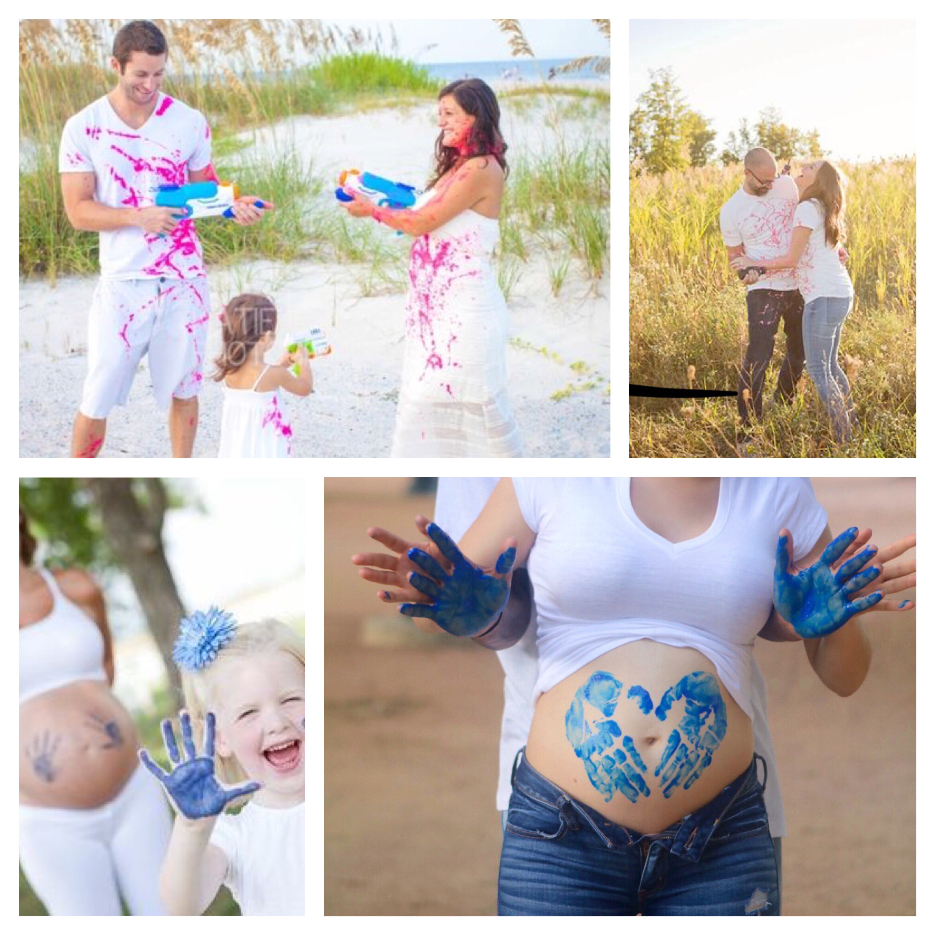 Pour les artistes dans l’âme, tenez-vous bien, cette « Gender Reveal » est fait pour vous ! J’aime beaucoup l’idée des traces de mains roses ou bleues en fonction du sexe du bébé. Le papa (par exemple) badigeonne la paume de ses mains de bleu ou de rose. Il positionne ses mains sur le ventre de maman… la révélation a lieu lorsqu’il enlève ses mains ! Mais l’idée que je préfère encore plus avec de la peinture est cette fameuse bataille comme au paintball ! On s’arme de tube de peinture bleu ou rose et GROSSE BATAILLE !!! Vous pouvez faire un bataille de peinture en duo mais bien évidemment le mieux reste de donner les tubes de peinture (neutre) aux membres de la famille pour qu’il puisse avoir le plaisir de vous badigeonner de peinture tout en découvrant le sexe du bébé !