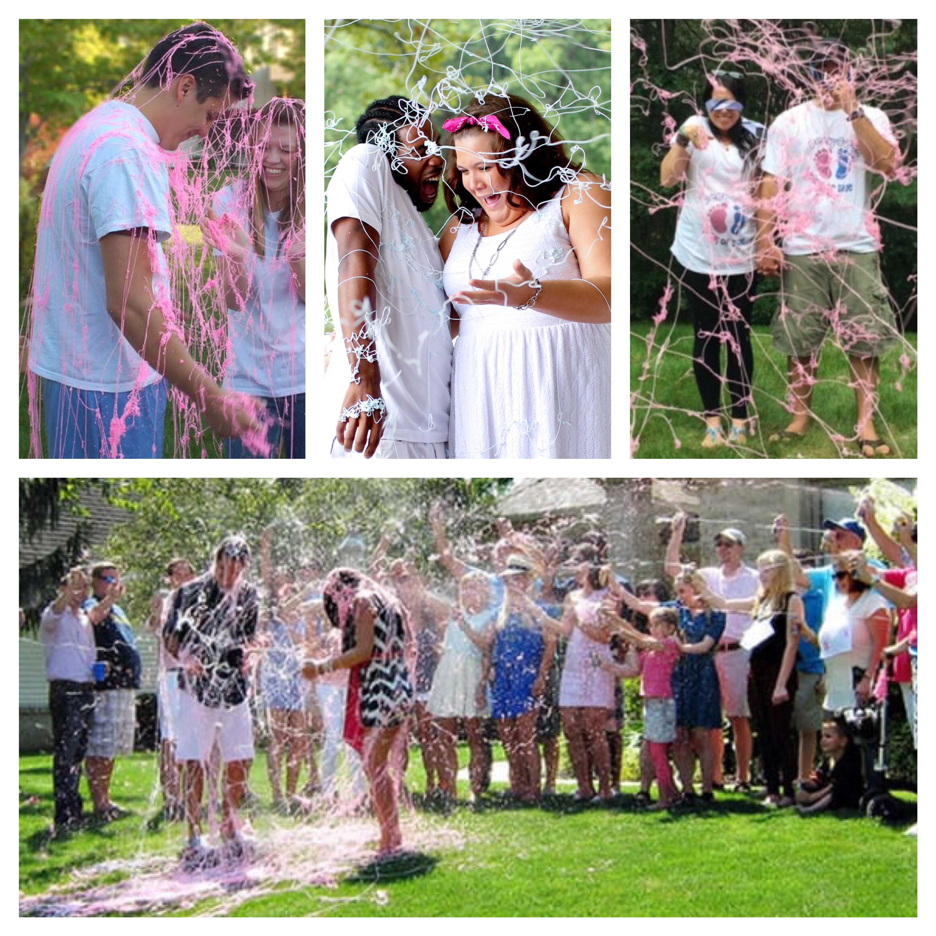 Pour rester dans l’ambiance « Bataille », plutôt que d’utiliser de la peinture, voici une alternative un peu moins salissante ! Notamment si vous comptez faire cela à l’intérieur ^^ Il s’agit d’utiliser des bombes de fils serpentin de la couleur du sexe du bébé. Vous savez les bombes de serpentin que l’on utilise pour le carnaval !! Alors oui, je ne garantis pas aucune tâche sur les vêtements car les filaments sont super gras mais cela reste moins salissant que la peinture ^^ Le principe est le même que pour la bataille de peinture, soit en duo ou bien en laissant le plaisir à la famille de nous asperger de serpentin avec les bombes préalablement recouverte pour ne pas dévoiler trop tôt la couleur qui se cache à l’intérieur !