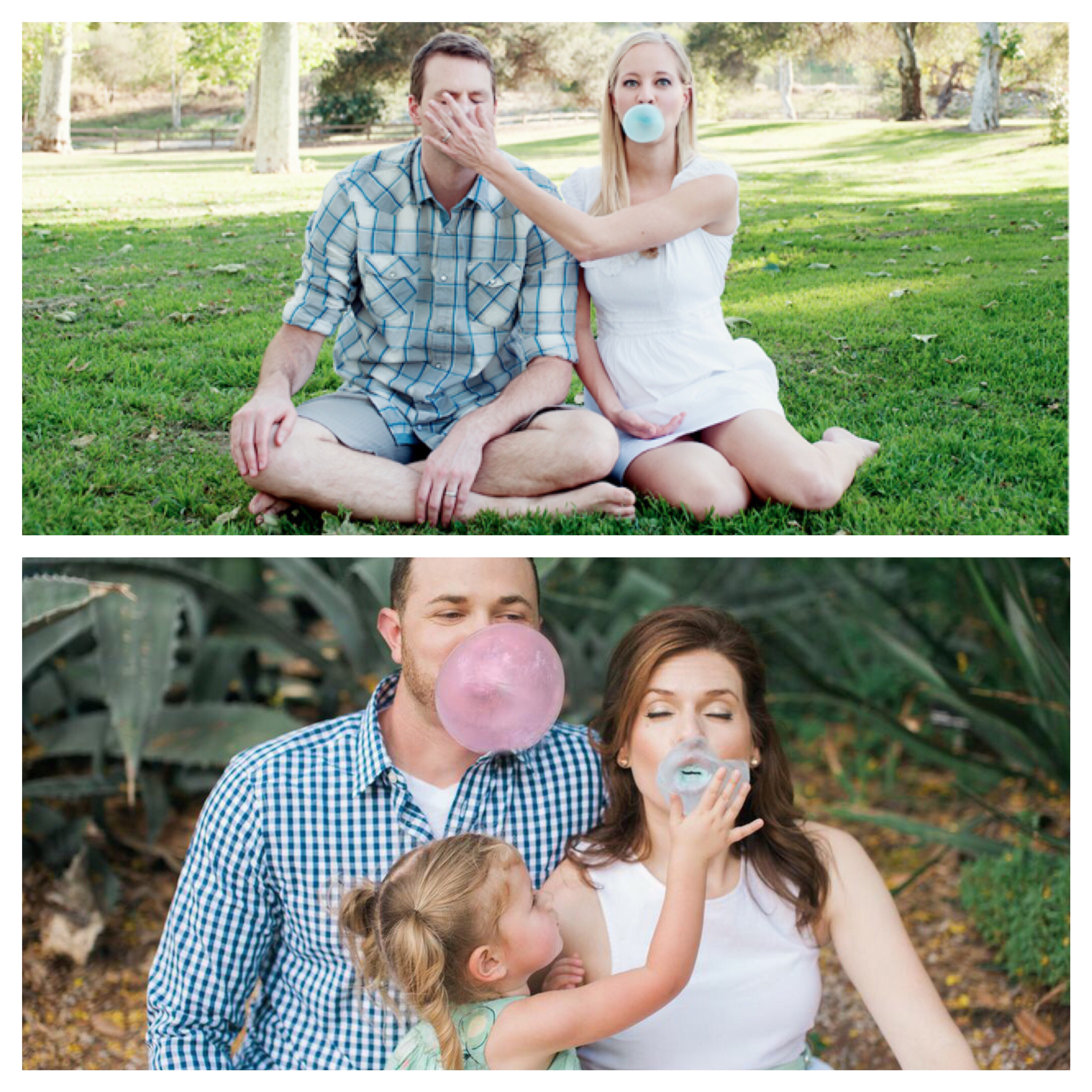 Fou rire assuré, le principe est très drôle. 2 personnes (en général le futur papa et la future maman) prennent tous les deux un chewing-gum de couleurs différentes. Ensemble, ils essaient (oui je pense que ce n’est pas forcément évident d’être synchro et ne pas rire) de faire une bulle. Puis d’une tape magistrale, le futur papa ou la future maman vient exploser la bulle qui ne correspond pas à la couleur du sexe du bébé !