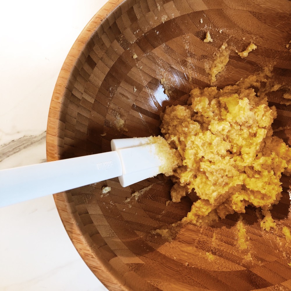 Dans un saladier, casser les 2 œufs, ajouter les 100g de sucre, les 100g de poudre d’amandes, les 100g de beurre pommade (beurre à température ambiante, souple, que l’on peut travailler à la spatule) et bien mélanger (on touille touille comme dit Jade 😂) afin d’obtenir une pâte lisse.