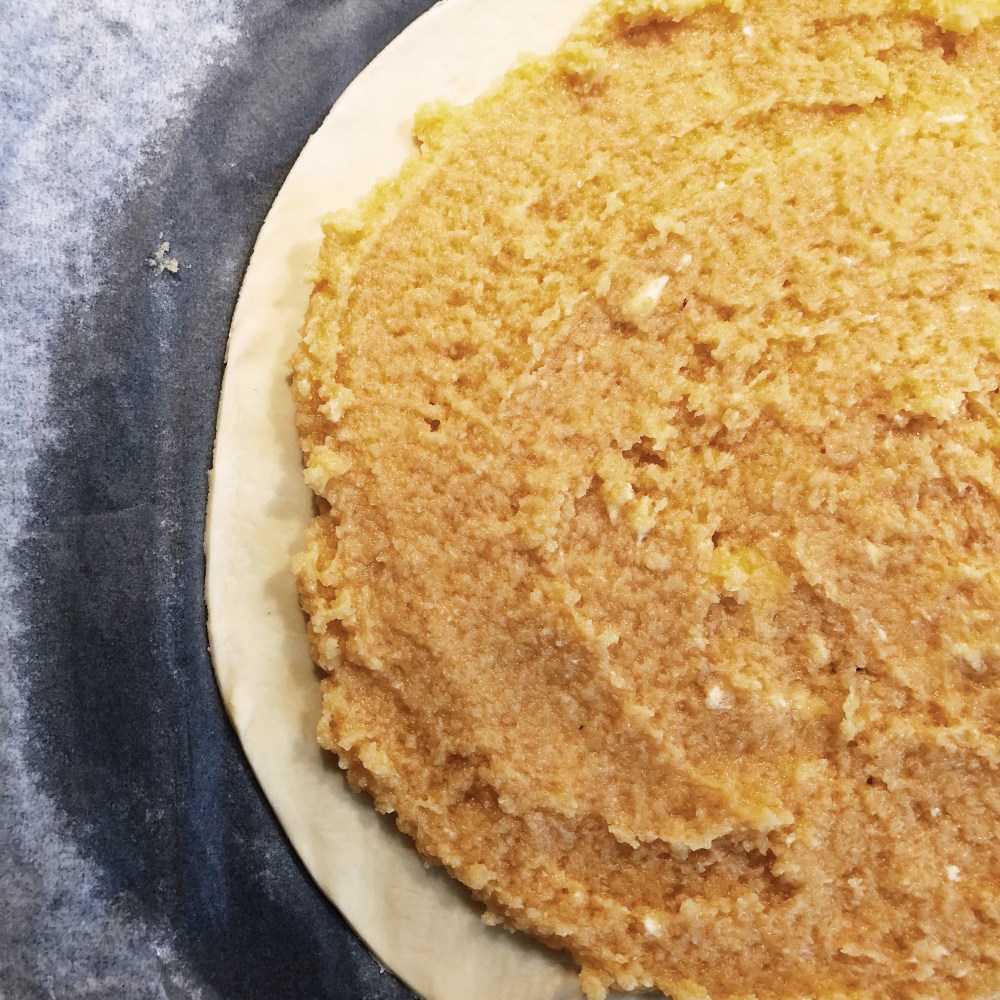 Disposer une pâte feuilletée et étaler la crème d’amande en laissant 2cm de pâte tout autour que l’on va humidifier avec un peu d’eau