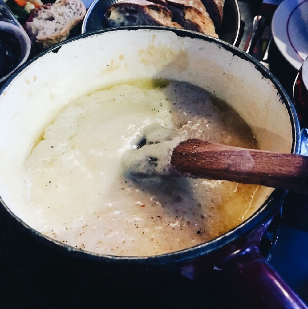 Des nappes enduites comme chez mamie, des serveurs en tenues traditionnelles avec béret sur le côté et la fondue des montagnards généreuse avec du beaufort, du cousin et de l’abondance !