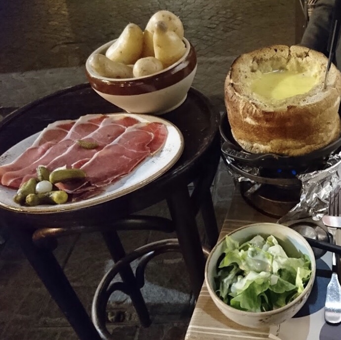 Vous ne connaissez pas ? Et bien je dirai que c’est une revisite de la fondue avec du fromage suisse (type vacherin) fondu dans un pain de campagne et servie avec de la charcuterie et du jambon cru de savoie… rien que ça ^^