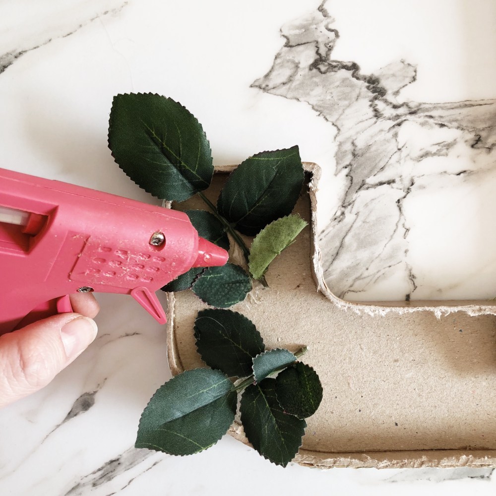 3 – Commencer par placer les feuilles notamment sur les angles qui seront difficiles à cacher par les fleurs avec les feuilles. Puis les coller avec le pistolet à colle.