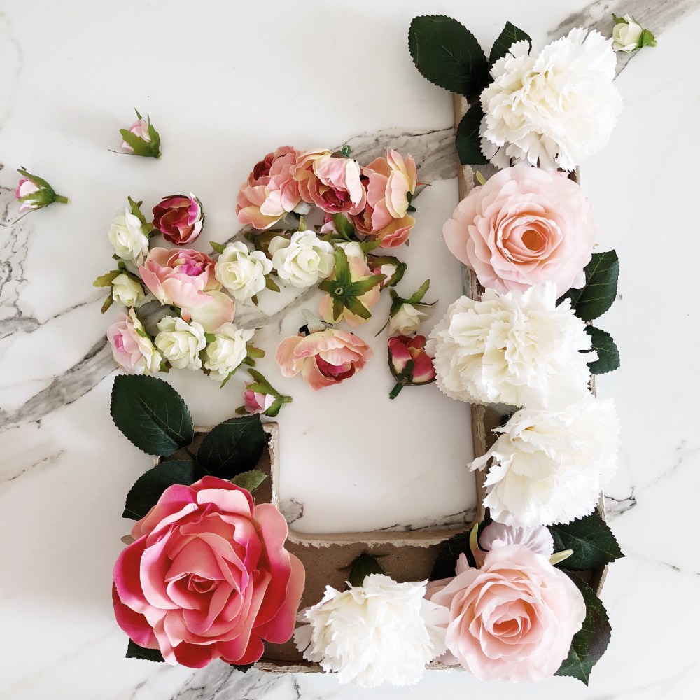 1 – Découper les tiges au plus près des fleurs. Plus les tiges seront courtes et plus vous pourrez coller les fleurs à plat sur les lettres. Garder également des feuilles.