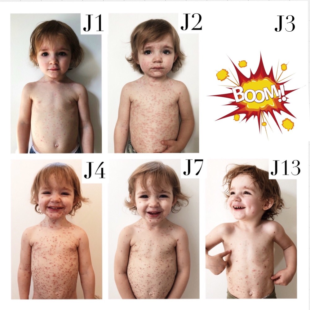A J10, les croûtes tombent ! Alleluia ! Jade est super contente de les voir partir et dit « Aurevoir coquin bouton ! ». Elle est également contente car nous lui avions expliqué que temps que les petits coquins de boutons étaient sur elle, elle ne pouvait pas faire de bisous et de câlins à son petit frère pour éviter qu’ils sautent sur lui. Elle a été très compréhensive.