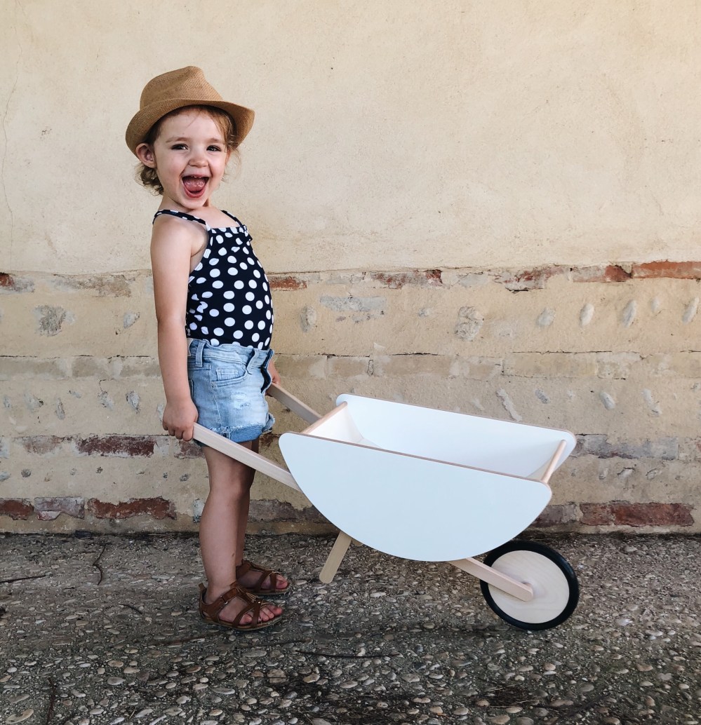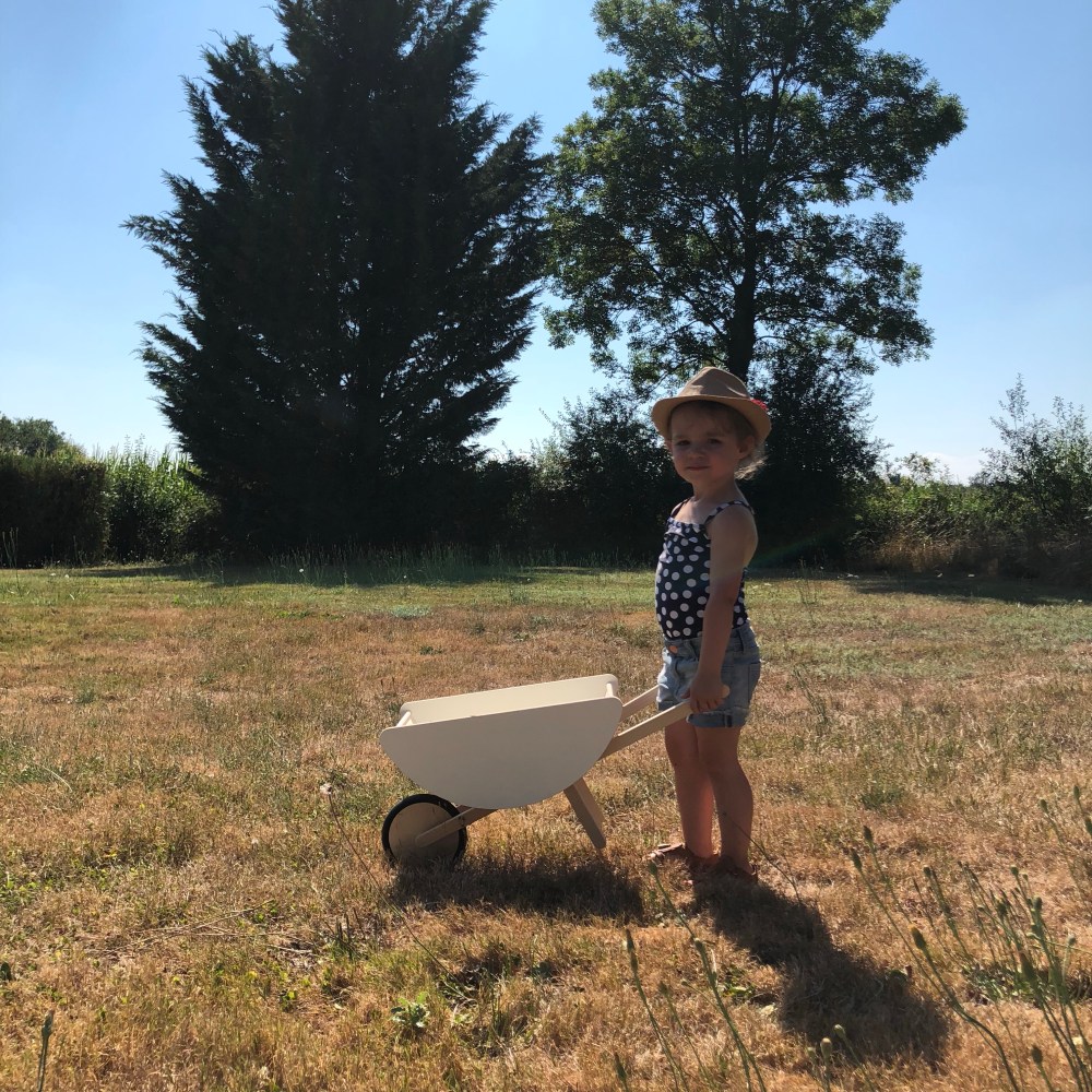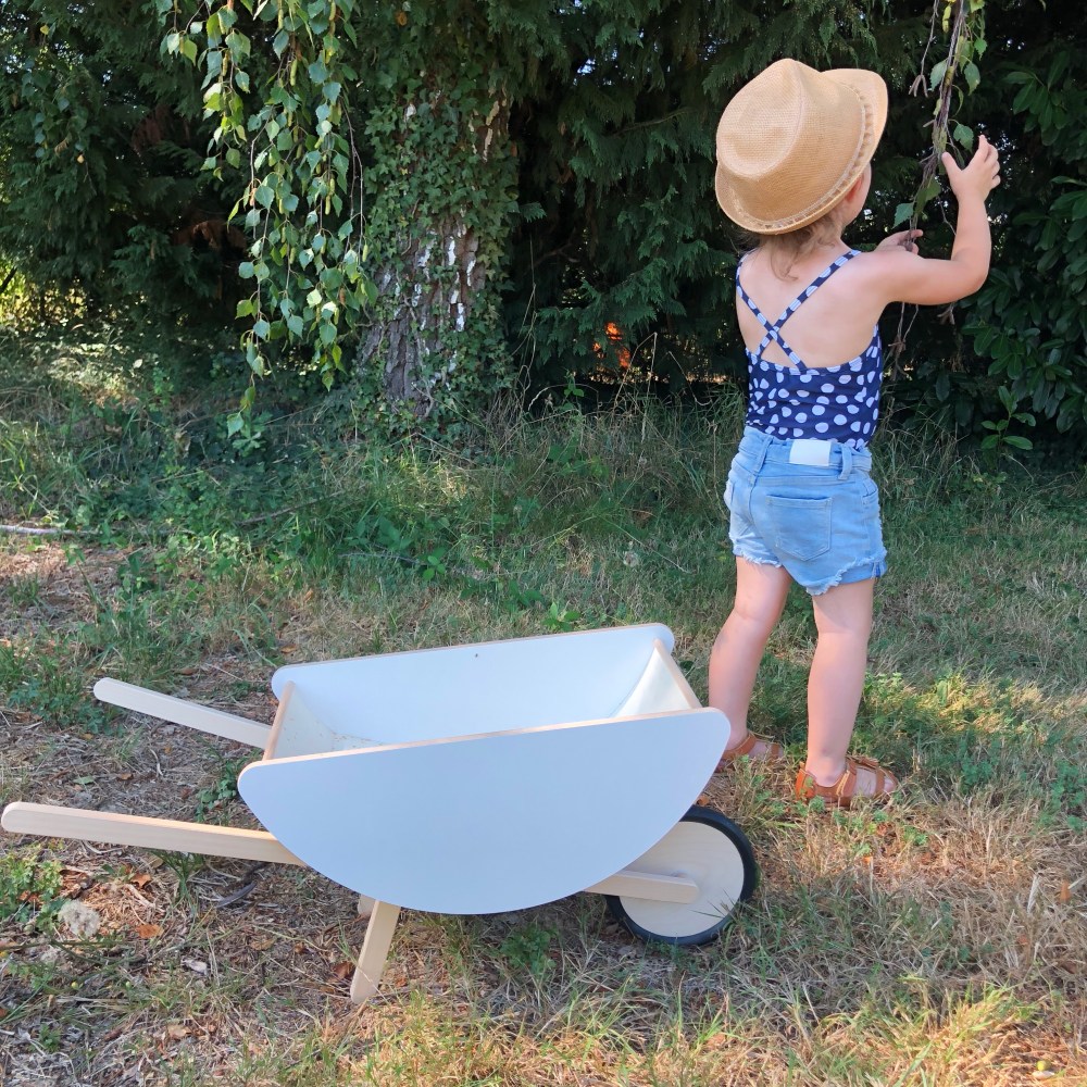 Les produits sont choisis avec soin, des univers se crée, une harmonie se profile au fur à mesure des pages. Décoration, prêt à porter, jeux… ici on a jeté notre dévolu sur une petite brouette en bois que Jade n’a pas quittée de l’été pour jardiner.
