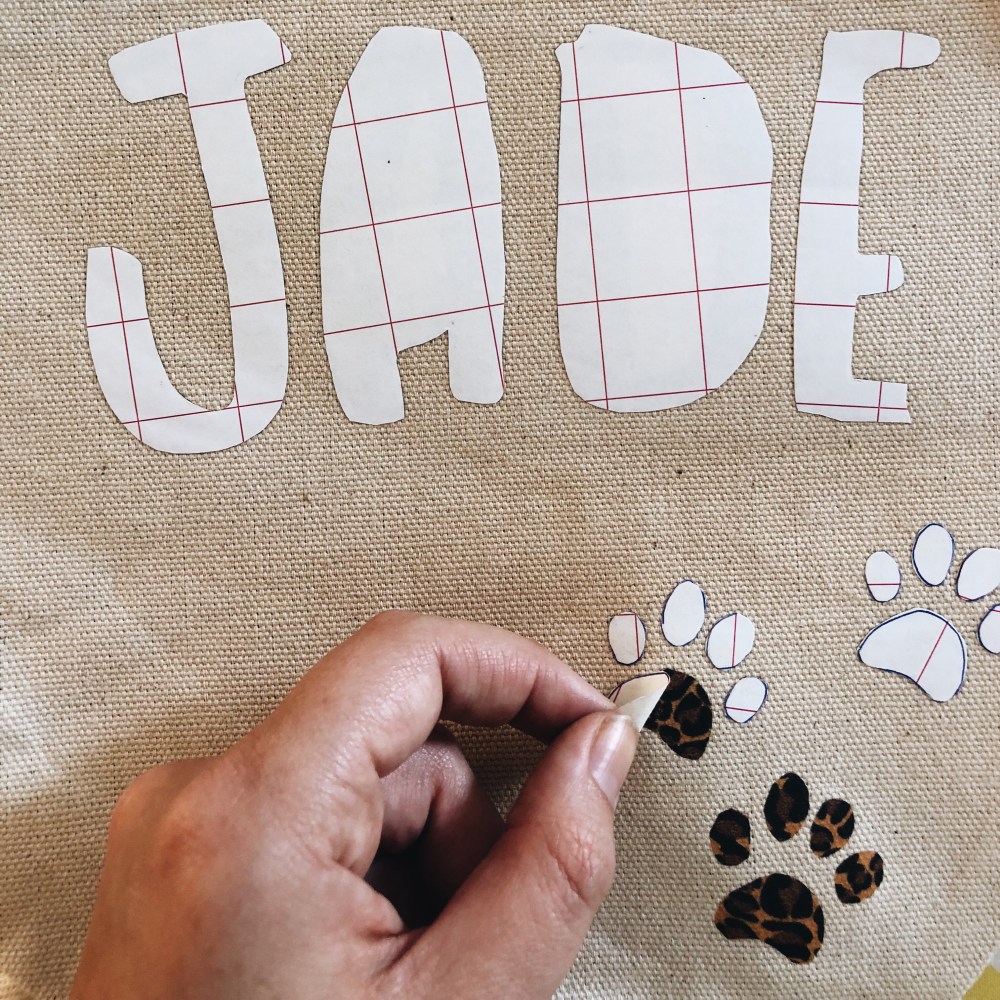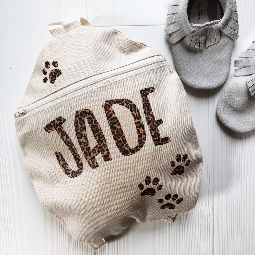 Pour ce sac à dos, j’ai simplement écrit le prénom de ma poulette sur l’application en choisissant un fond léopard (pris sur google). J’ai également choisi d’ajouter des petites traces de pattes. Pour cela, j’ai simplement repris le même fond léopard et dessiné à la main les traces de pattes sur le papier une fois imprimé.