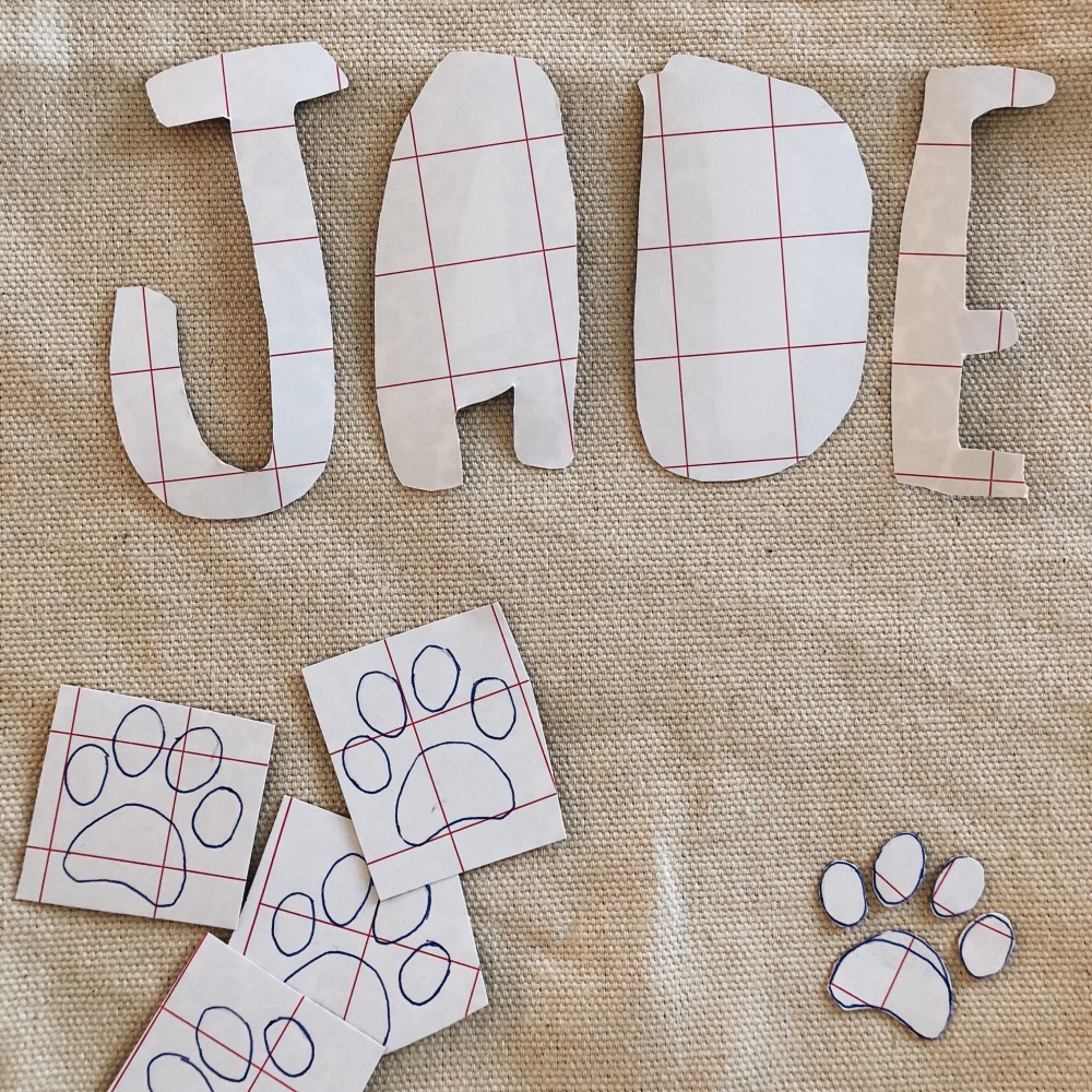 Avec du papier transfert pour tissus clairs, vous n’avez pas forcément besoin de découper chaques lettres au millimètre près. Les parties non imprimées (par exemple l’intérieur des lettres A et D pour JADE) seront transparentes après transfert (contrairement aux papiers transferts pour tissus foncés où les parties non imprimées sont blanches).