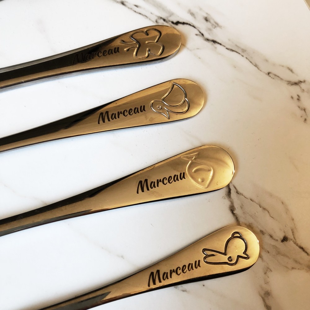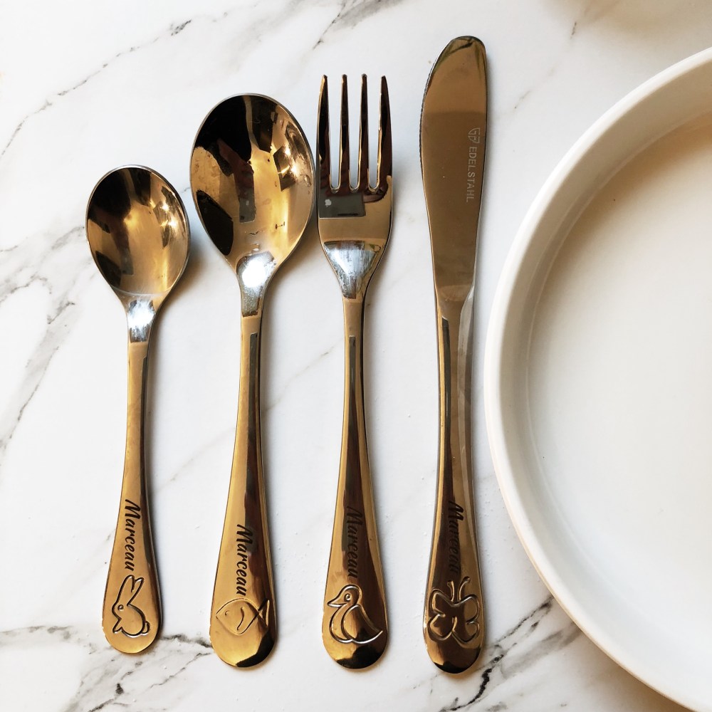 … Et comme je suis faible, j’ai aussi craqué sur leur site pour un petit ensemble de couverts gravés. Je pense que certains pourront trouvé cela un peu kitch mais Jade en avait reçu un set par sa grande tante et j’avais trouvé cela adorable. Pour compléter la collection, c’est naturellement que j’ai eu envie de créer un set pour Marceau (même si Jade pense fermement qu’il est écrit Jade sur ces couverts ^^) .