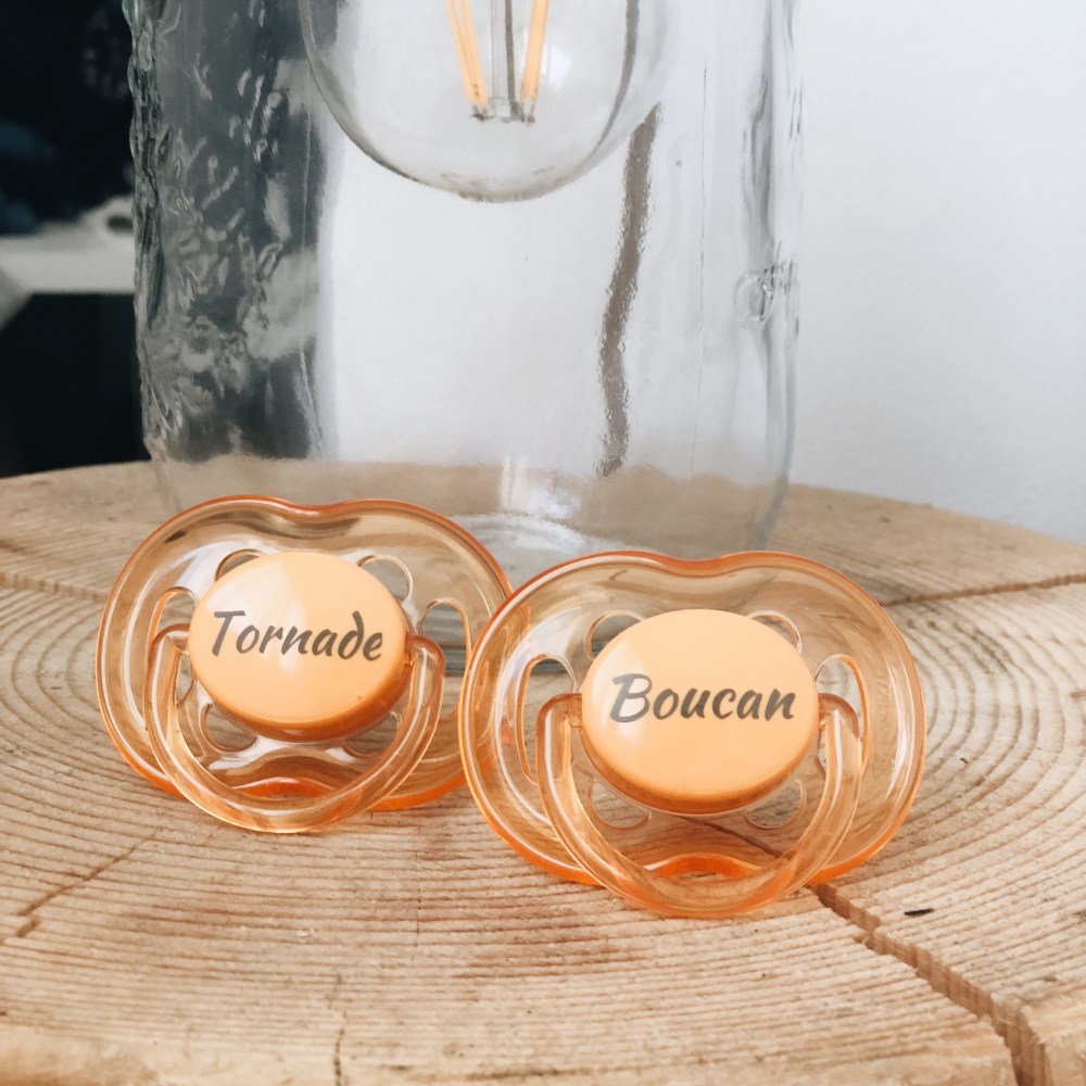 Alors j’avais déjà vu quelques sucettes personnalisées et d’ailleurs la marraine de Jade lui en avait offerte beaucoup avec son prénom écrit dessus mais à peine mis en bouche que Jade les recrachait directement ! C’est un peu l’inconvénient des sucettes personnalisées, en général je ne retrouve pas LA sucette que mes enfants ont adopté.