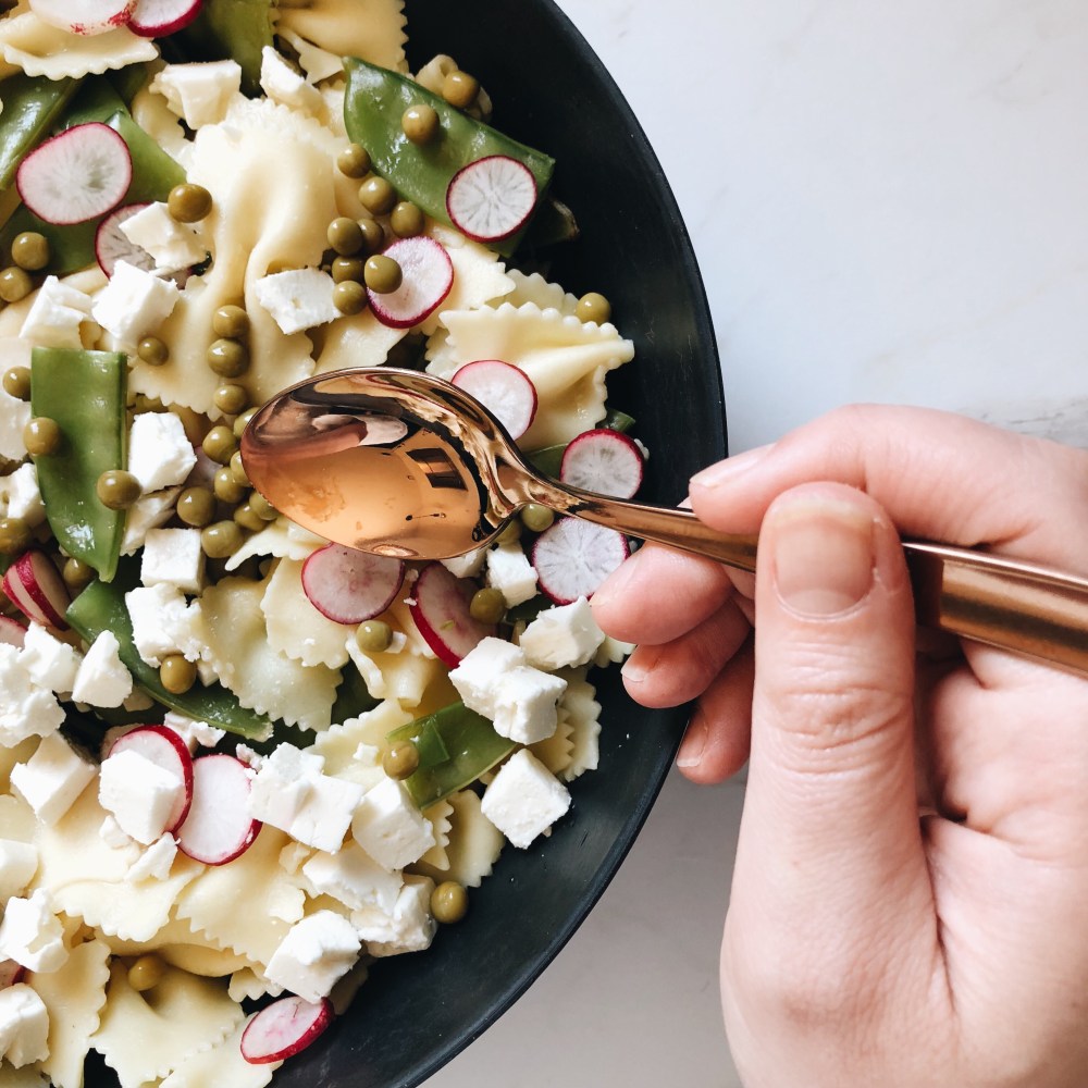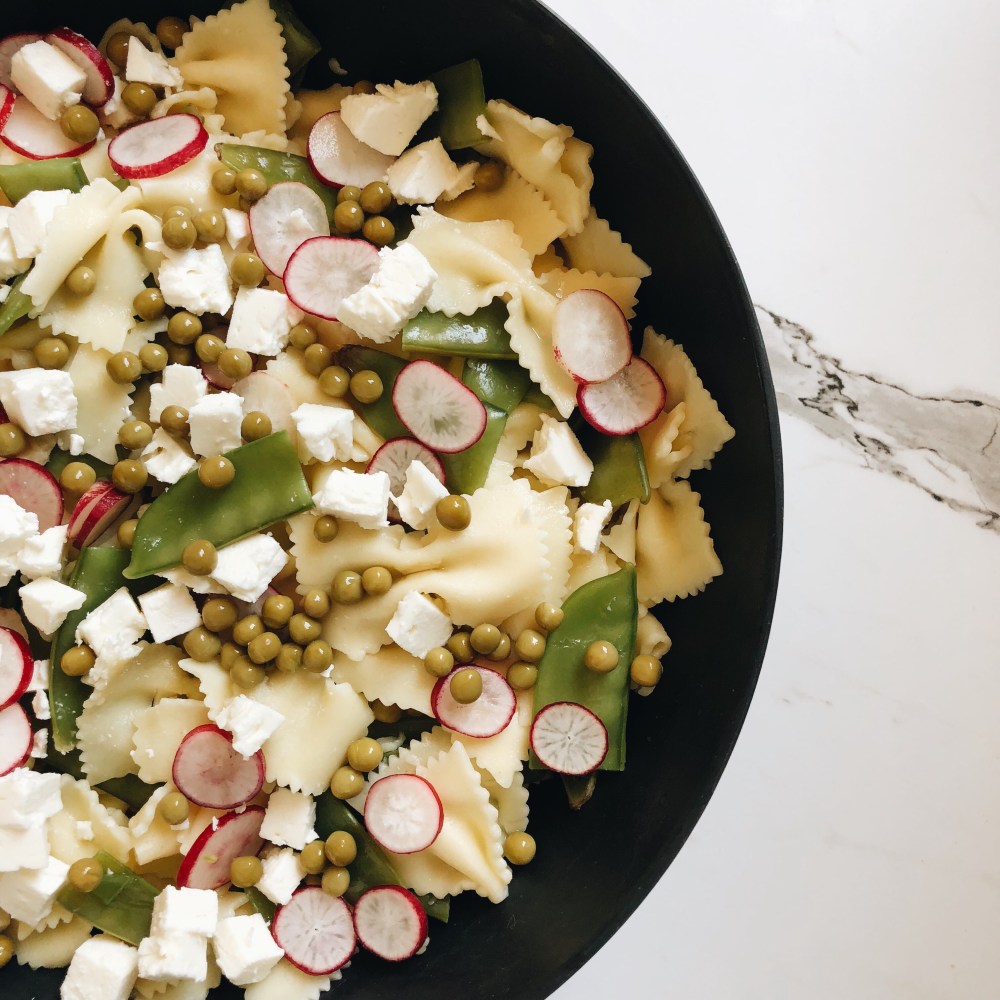 Pour 4-6 personnes, vous aurez besoin de 250g de farfalles (les pâtes en forme de nœud papillon), 150g de pois gourmand, 400g de petit pois, une dizaine de radis roses et 100g de féta.