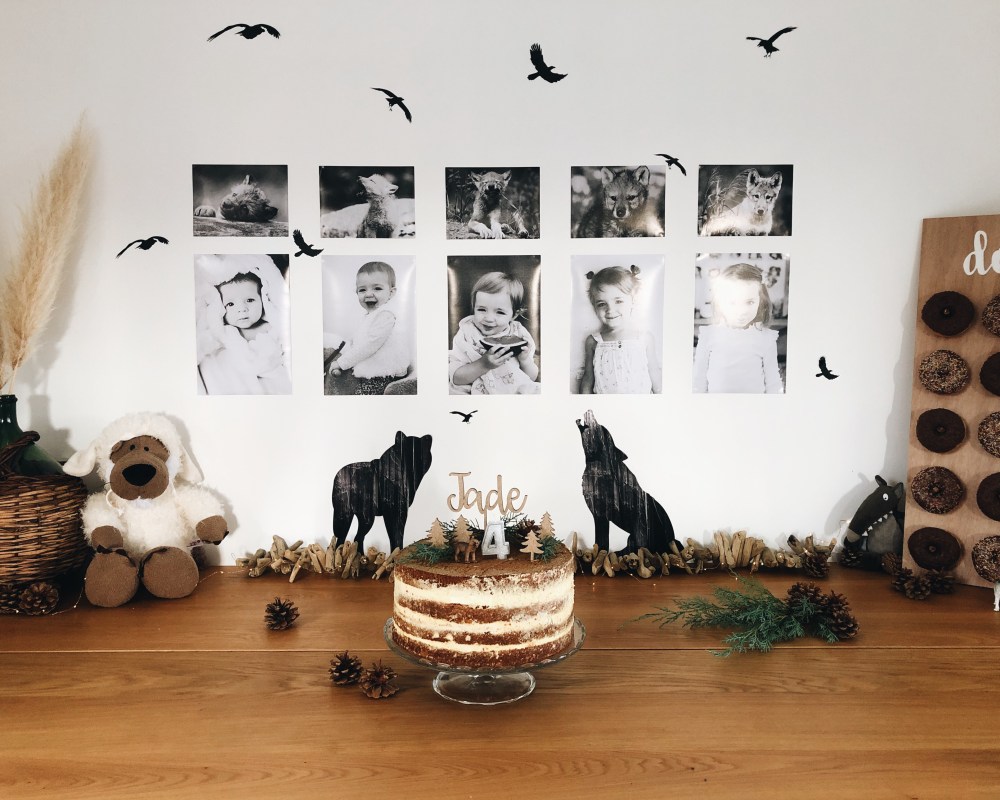 Pour la décoration, j’ai misé sur la simplicité avec un soupçon de mignonnerie. Une frise chronologique avec un parallèle entre Jade et le loup. Une photo d’elle pour chaque année. Sa naissance, 1an, 2 ans, 3 ans et puis 4. Et ces petits loups qui grandissent eux aussi.