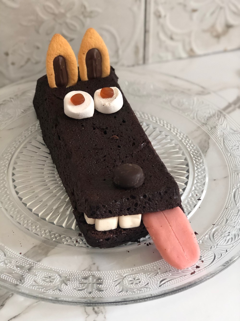 Une fois refroidi et démoulé, on coupe le gâteau à mi hauteur, jusqu’à la moitié du gâteau. On forme ainsi la gueule du loup. Et on se fait plaisir sur la déco : langue en pâte d’amande, dents en bonbon Krema, nez en michoko, yeux en guimauve et dragibus et enfin les oreilles en barquette au chocolat.