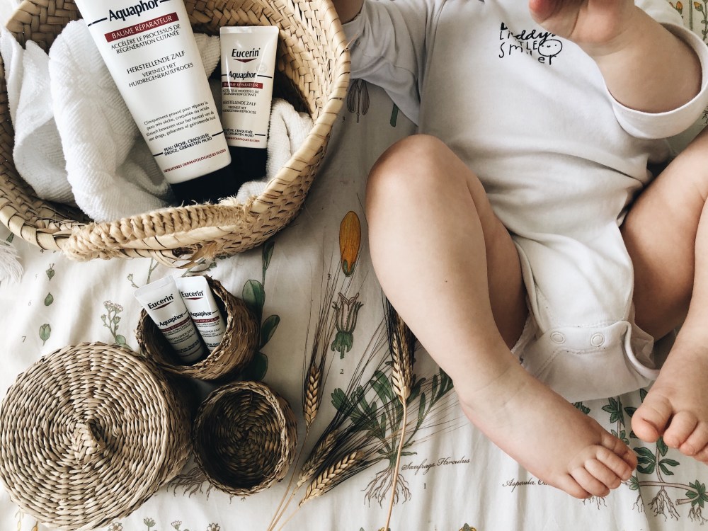 On limite les bains quotidiens. Car l’eau trop chaude, trop longtemps détruit les facteurs naturels d’hydratation de la peau, et les lipides de surface. On privilégie alors les douches et l’eau tiède. On utilise des nettoyants doux et on établit une routine de soin quotidienne : on hydrate le corps de Marceau immédiatement après le nettoyage afin de prévenir l’évaporation de l’eau de sa peau. Cela renforce sa barrière cutanée naturelle et le soulage. Parfois, une fois par jour n’est pas suffisant pour des zones particulièrement sèches et irritées, comme les joues ou la zone de change. Alors on multiplie la fréquence des soins. Pour cela, on utilise le Baume Réparateur Eucerin Aquaphor ,un hydratant idéal pour sa peau sèche de bébé qui convient aussi bien sur le visage que dans la zone de change. En complément, on privilégie des vêtements en fibre naturelle comme du coton. On évite en revanche la laine qui bien que naturelle peut irriter.