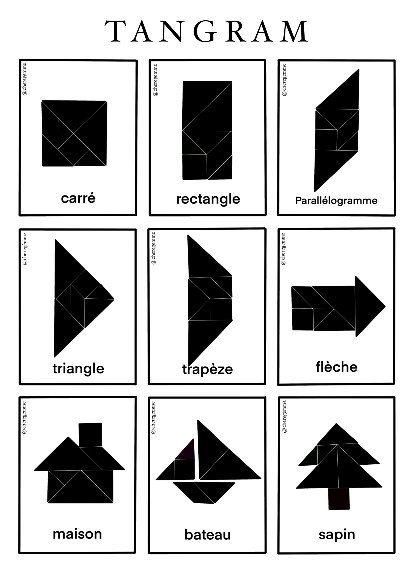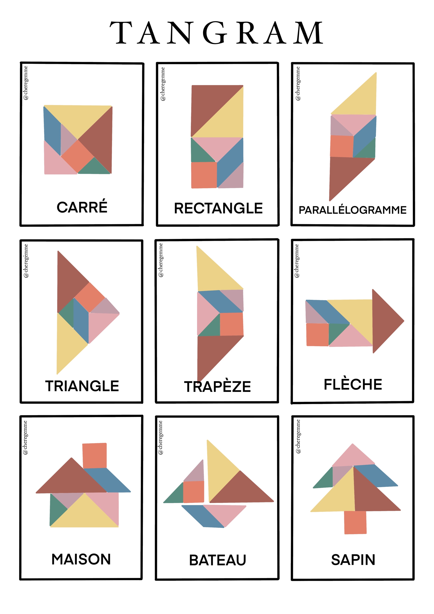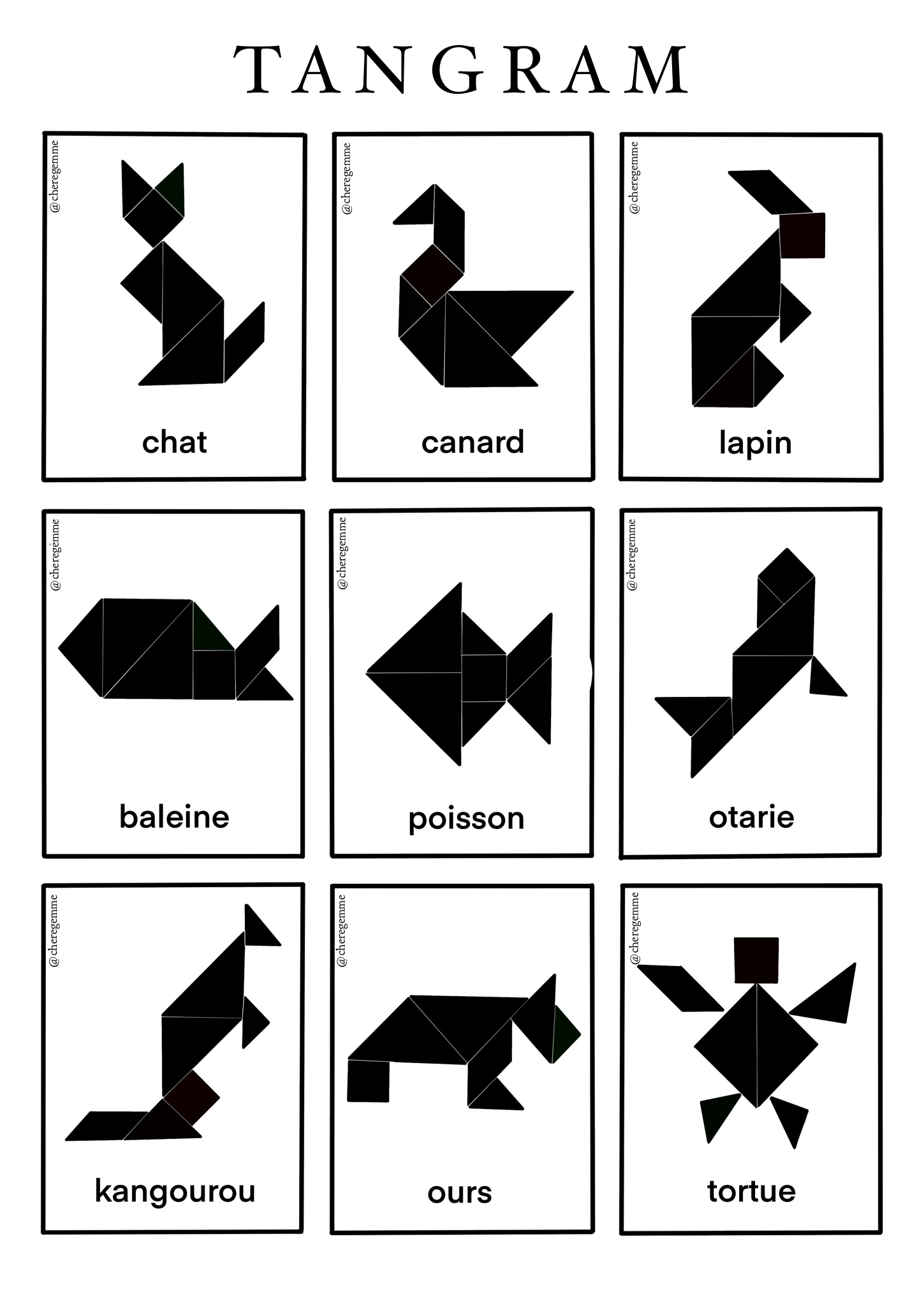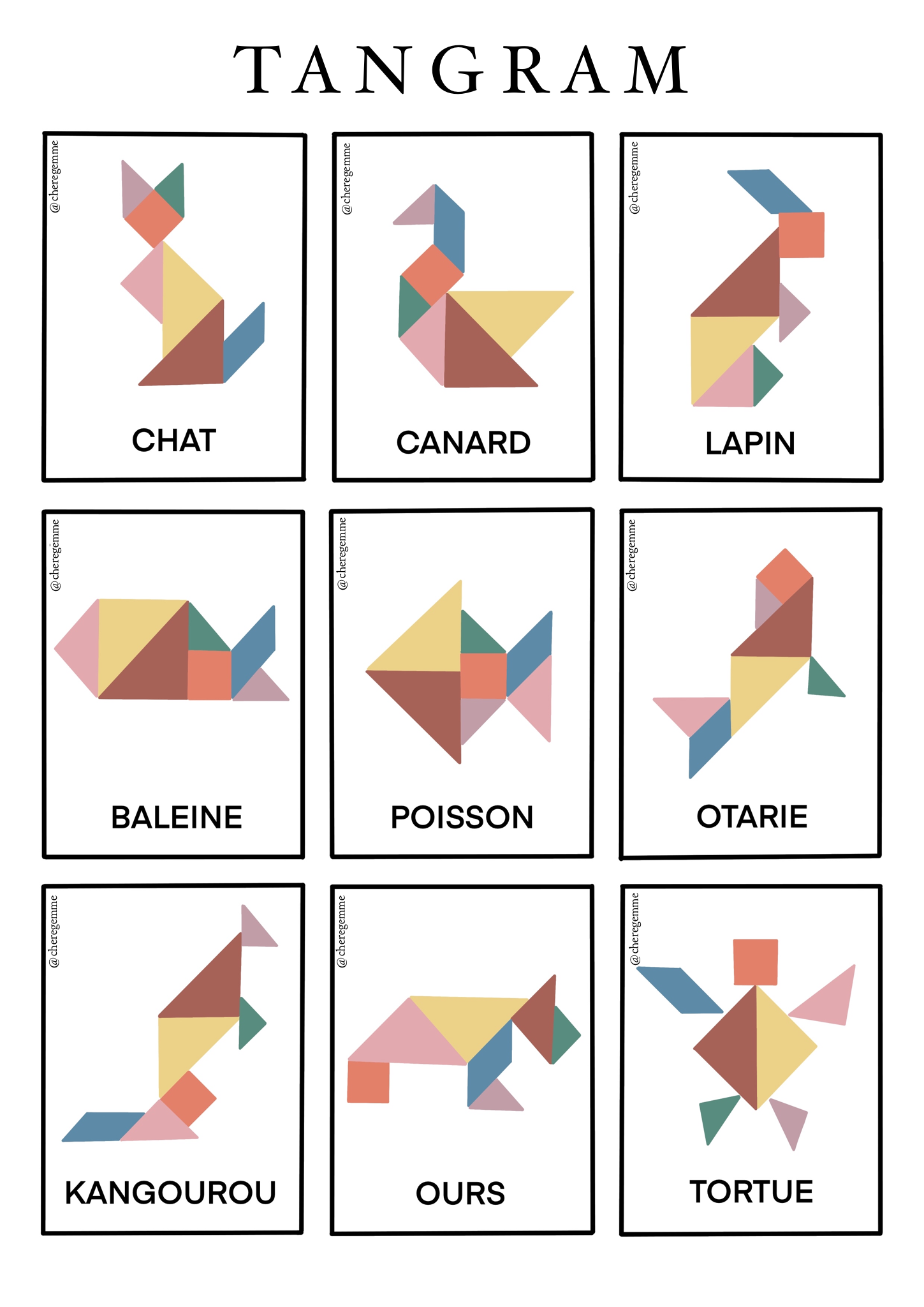 L’objectif est commun, à partir de 7 pièces – 5 triangles isocèles rectangles, 1 carré et 1 parallélogramme), reproduire des silhouettes : personnages, figures géométriques, objets, lettres de l’alphabet, chiffres, animaux…