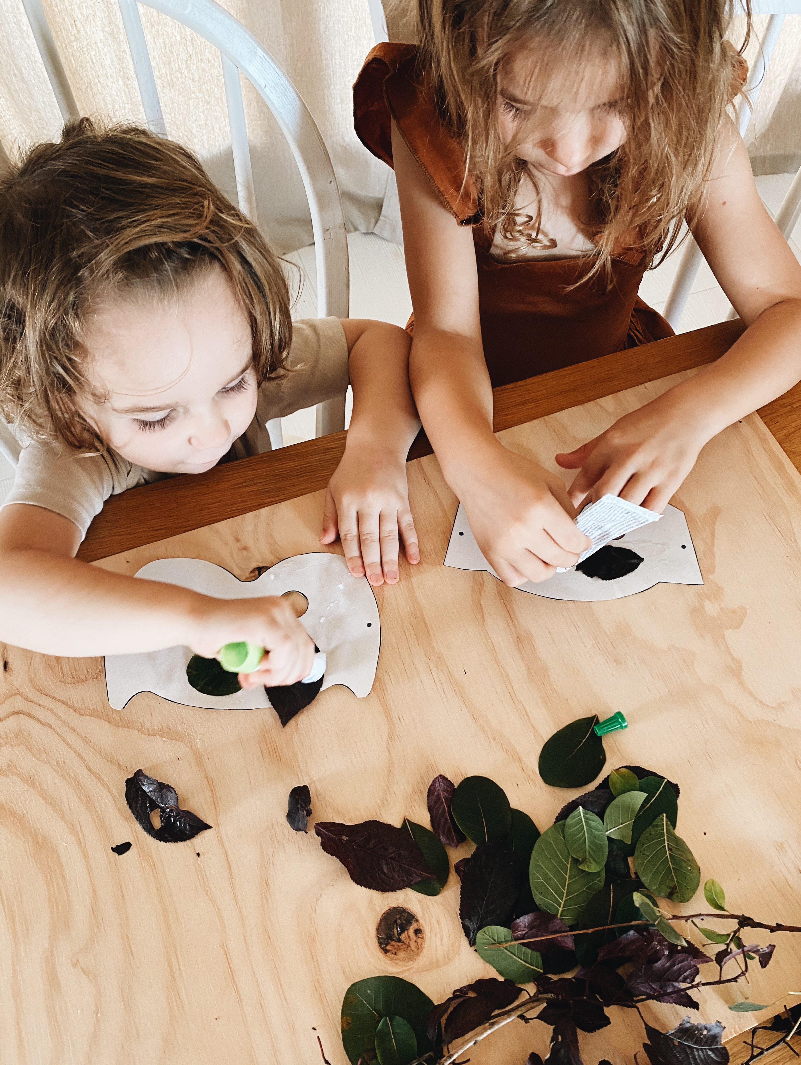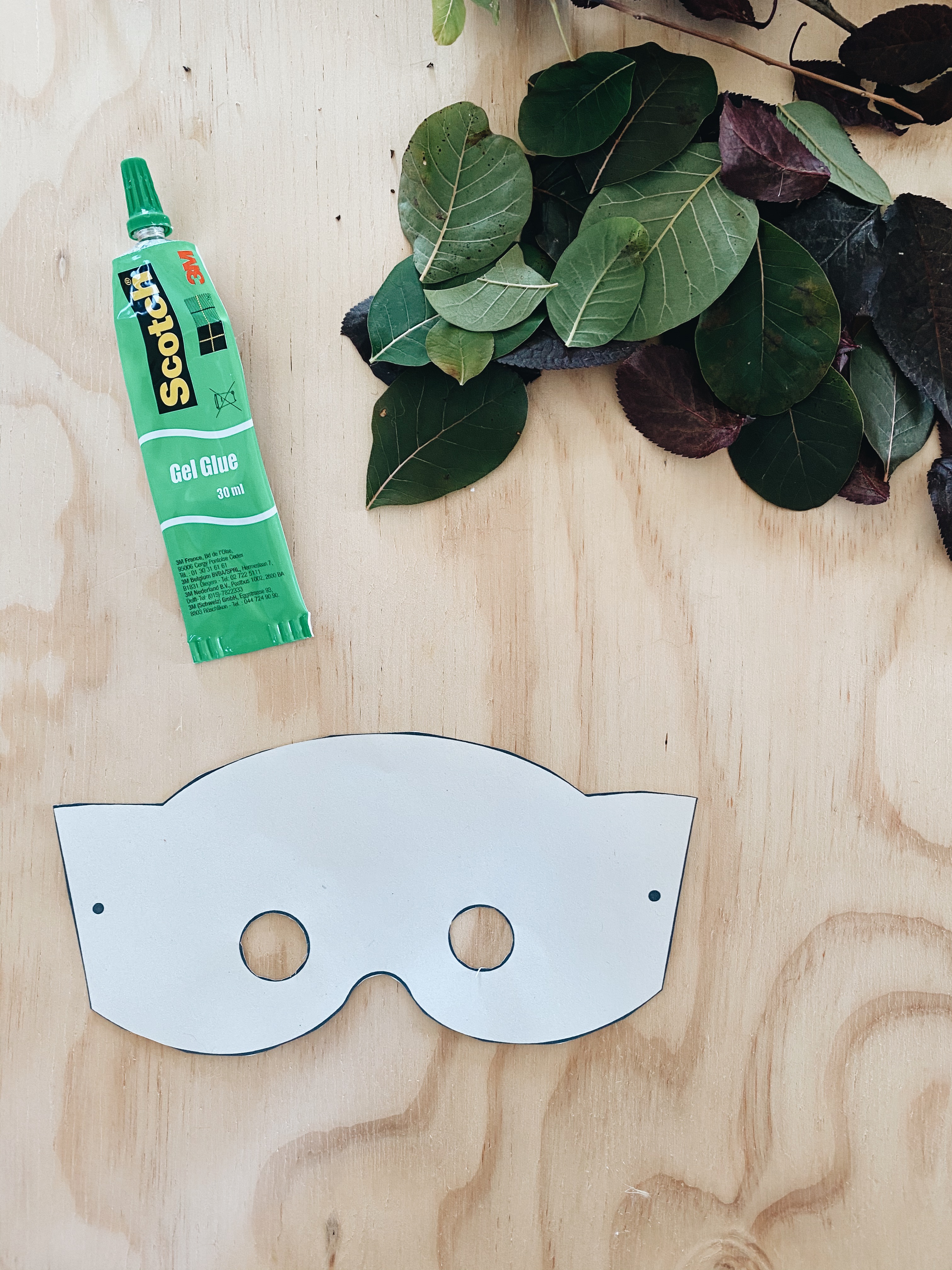 Découper le masque avec un cutter ou scalpel. Des ciseaux peuvent faire l’affaire sur du papier cartonné. A l’aide de colle (glu ou autre), coller les feuilles sur le masque.