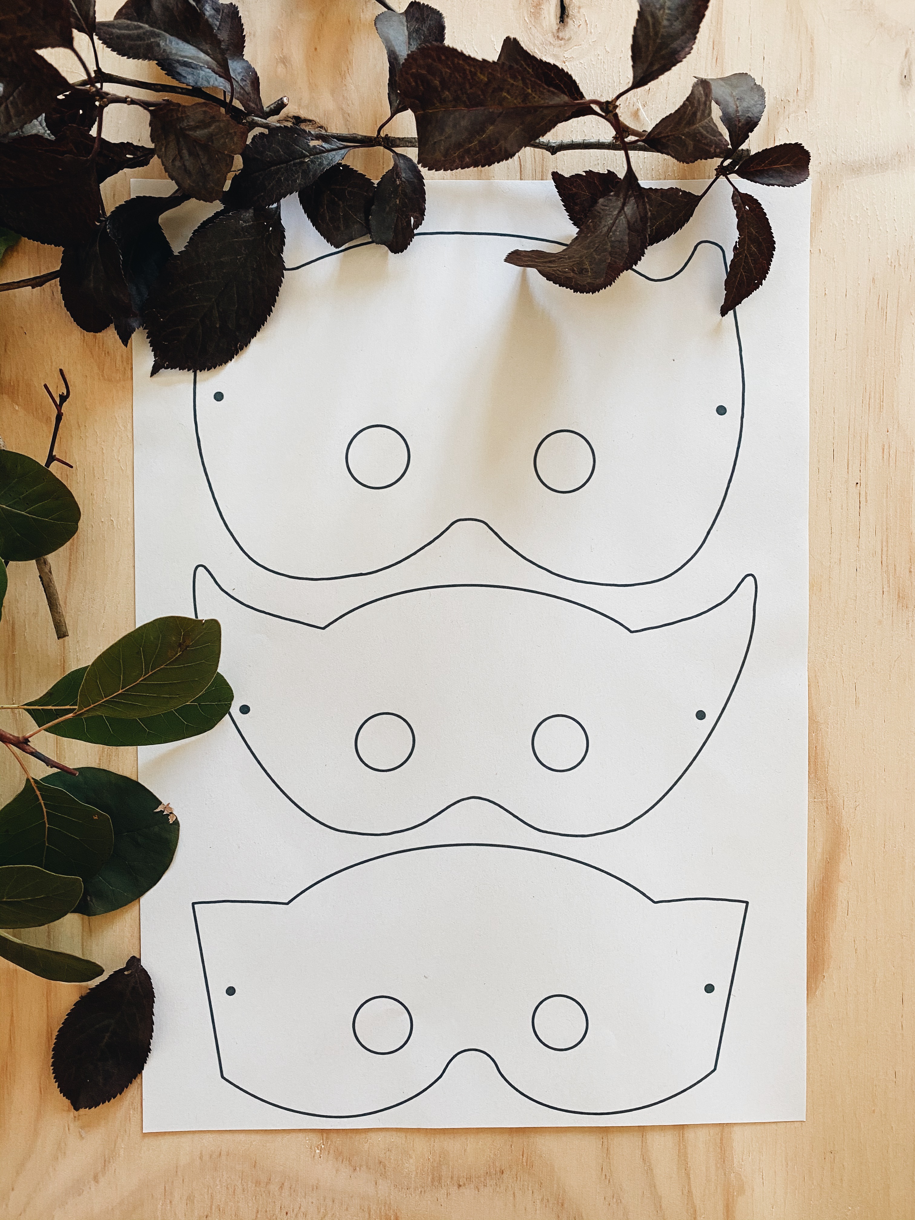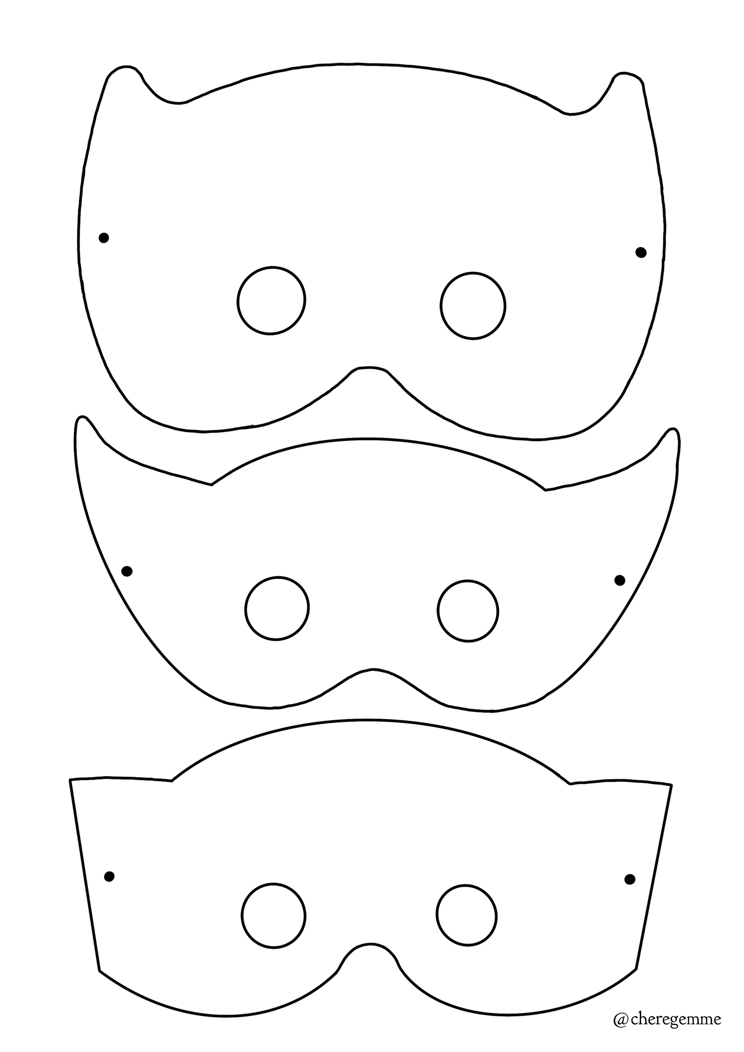 Sur du papier cartonné ou directement sur du carton, dessiner des masques. Des patrons sont disponibles en fin d’article pour vous aider si vous n’êtes pas à l’aise pour en dessiner à main levée.