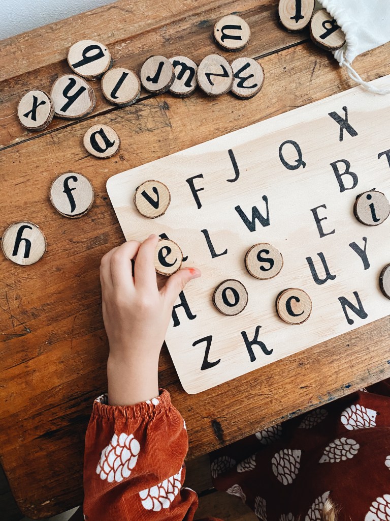 Pour se préparer en douceur à l’apprentissage de la lecture – Jade apprend les syllabes en ce moment à l’école – en plus des cartes alphabet, je viens de lui proposer un jeu d’association -fabrication maison- sur un plateau en bois. Cela lui permet de changer d’activité, de ne pas se lasser, et de connaitre et reconnaitre les lettres à travers différents supports ou différents jeux. Apprendre en s’amusant.