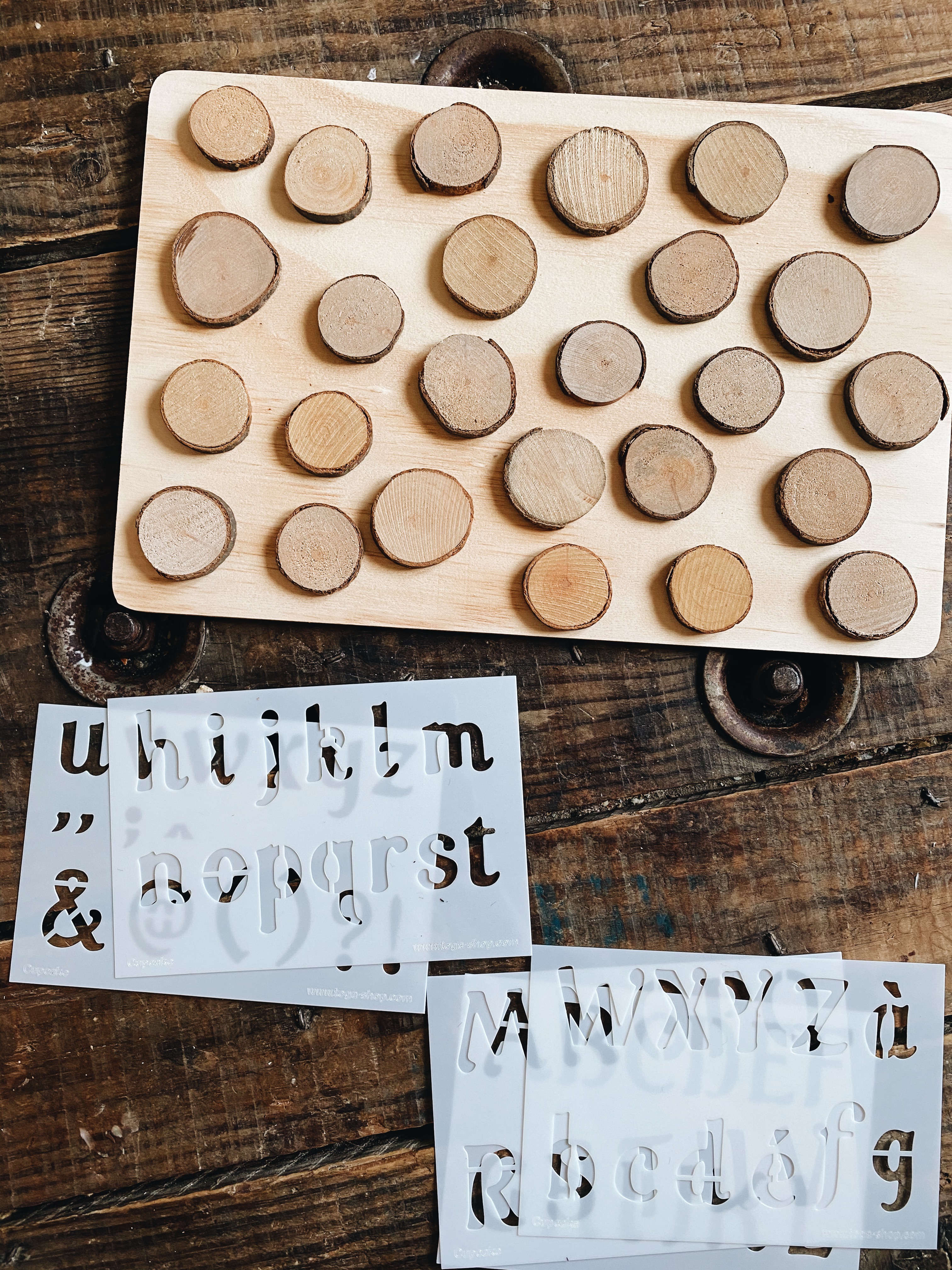Pour écrire les lettres sur la planche et sur les rondins, j’ai utilisé des pochoirs que j’avais déjà dans ma malle à activité. Ils ne sont pas indispensables, vous pouvez très bien noter les lettres sans pochoir. Mais si vous tenez vraiment à en utiliser un, vous en trouverez dans tous les magasins de loisir créatif comme chez Cultura.