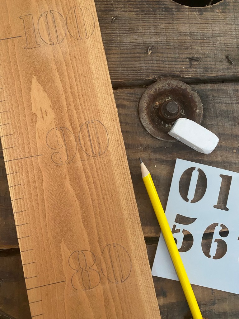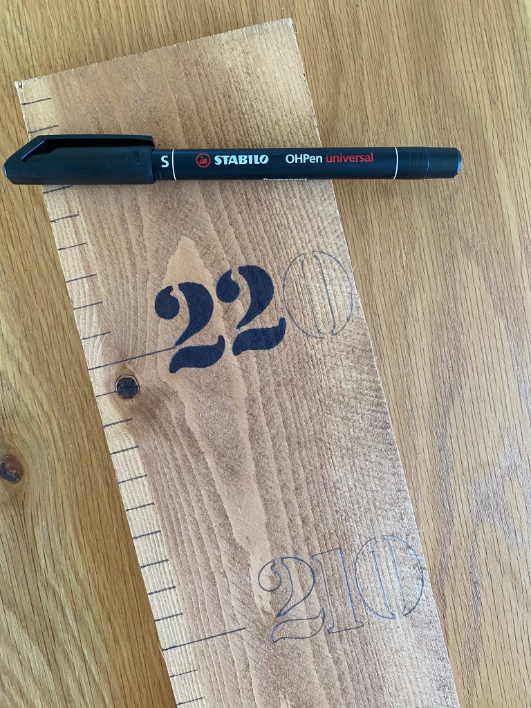 Pour ajouter les chiffres j’ai utilisé des pochoirs. Mes chiffres font 2,8 cm de haut. La seule attention à avoir à cette étape est de vous décider sur la première mesure à noter sur votre toise. Ici, j’ai décidé de faire débuter ma toise à 10 cm du sol (au dessus de la plinthe de mon parquet). Mais si vous souhaitez commencer votre toise à 50 ou encore 70 cm du sol, votre première mesure sera différente.