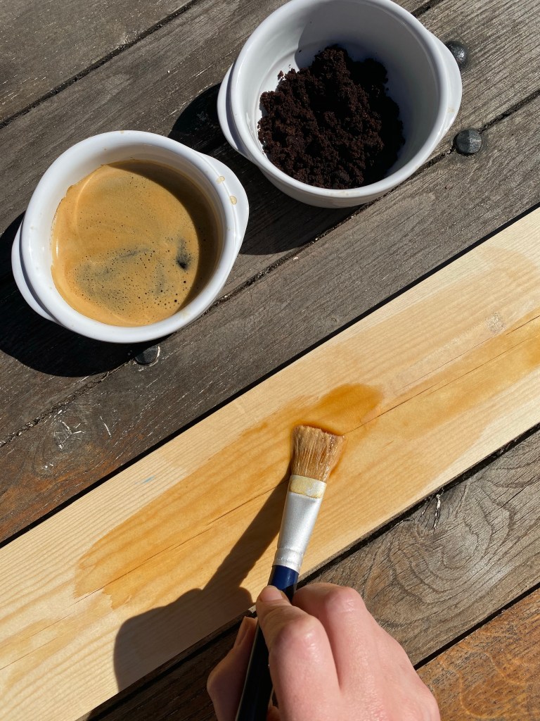 Pour donner un côté plus « noble » au sapin et une couleur plus foncée, j’ai teinté mon tasseau de bois avec du café et du marc de café. Vous allez avoir besoin d’un pinceau pour appliquer le café.