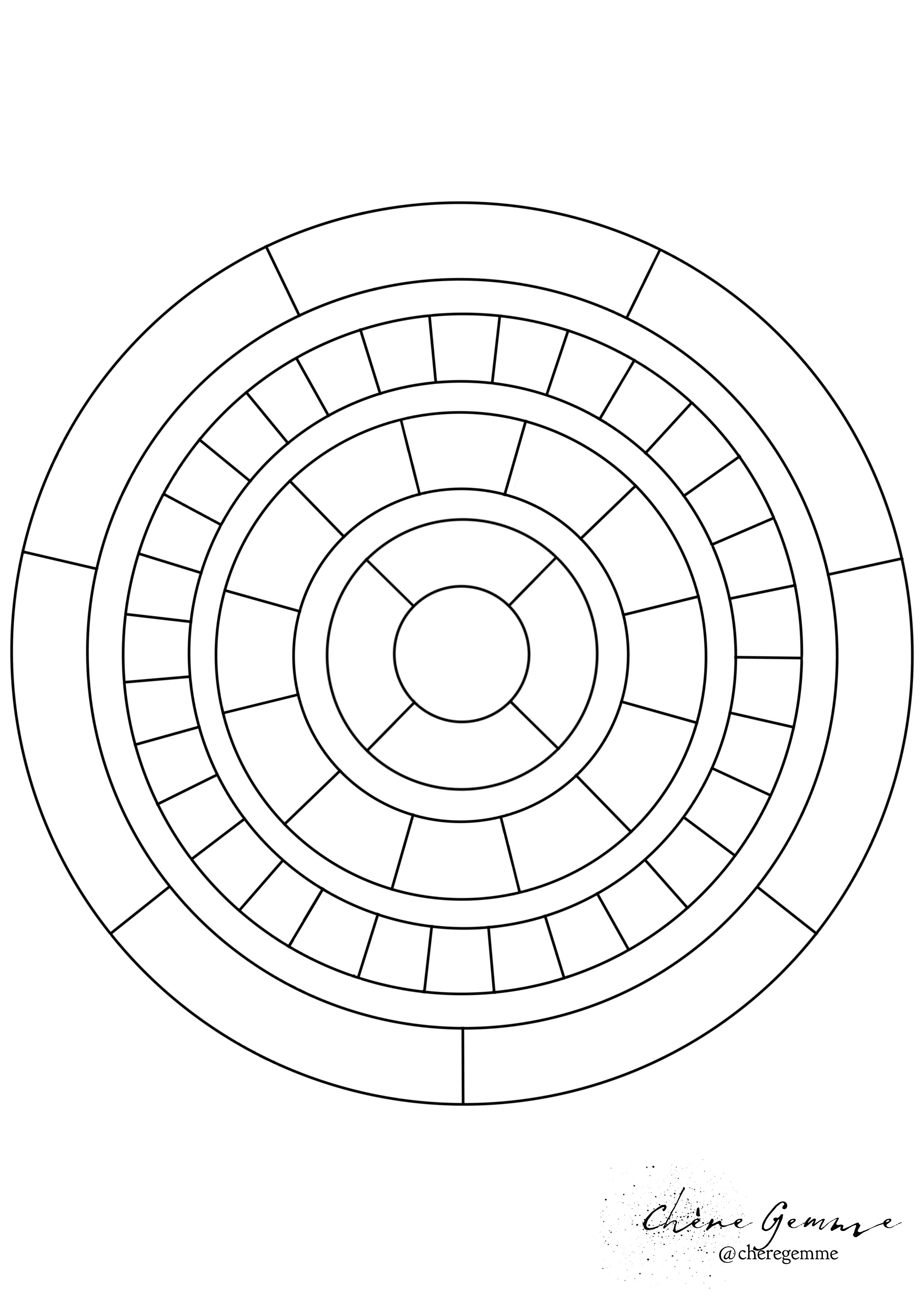 Chaque case d’une roue doit avoir la même taille. Pour séparer les roues de façon égale, on peut utiliser un rapporteur… ou l’on peut s’aider des patrons. Ma méthode avec les patrons n’est pas très précise mais à au moins le mérite de ne pas devoir trouver et utiliser un rapporteur ahaha ! Pour cela, superposer le patron à la roue en carton pour reporter les secteurs – Je fais des marques au crayon papier tout le tour de la roue). Une fois les marques reportées, tracer des droites de chaque marque jusqu’au centre pour définir les secteurs. Nous les effacerons une fois la roue personnalisée.