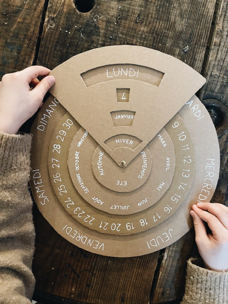 Ce calendrier perpétuel, je l’ai réalisé en carton, que je trouve plus agréable à manipuler. Mais le support pour le créer, à télécharger et imprimer est disponible en fin d’article. Vous pouvez le trouver déjà complété ou bien à personnaliser.