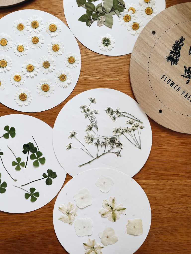 A la maison, nous aimons cueillir les fleurs qui poussent dans le jardin et les faire sécher dans notre presse fleurs.