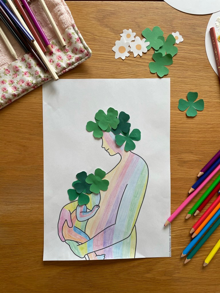 Pour ceux dont le temps n’es pas clément ou qui ne disposerait pas d’un coin de verdure, j’ai réalisé quelques planches de fleurs à découper : des fleurs colorées, des marguerites ou encore des trèfles à 4 feuilles pour les orner les dessins.