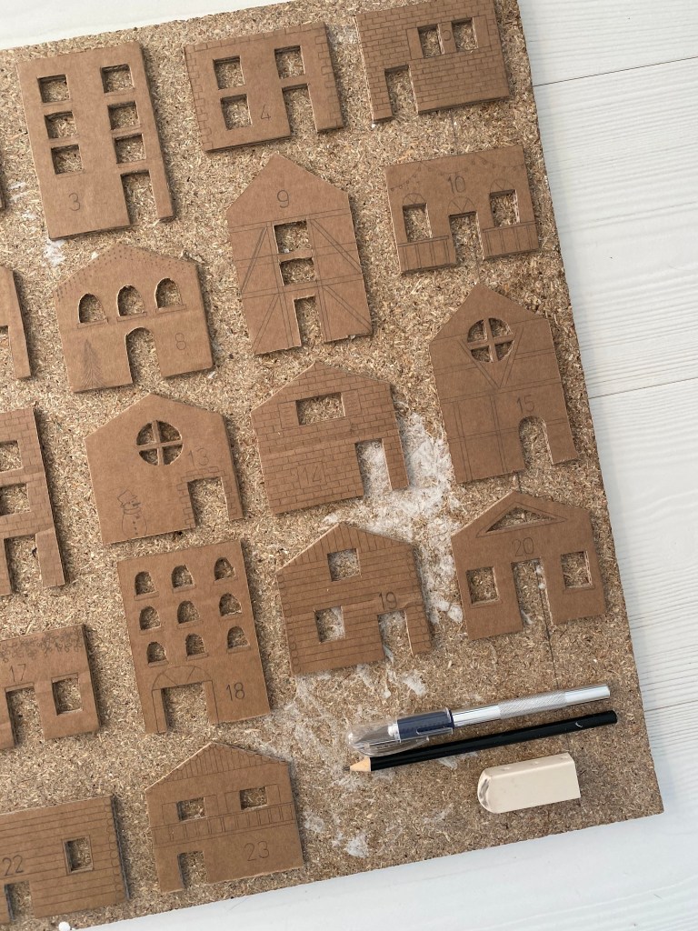Pour toutes les découpes, j’utilise un scalpel. Le scalpel permet de découper les 24 maisonnettes en carton avec précision. On peut également creuser quelques fenêtres et portes sur les façades (face avant des maisons essentiellement) mais l’ouverture des fenêtres et des portes n’est pas une étape indispensable car il est possible de passer directement à l’étape des dessins (surtout si on commence son calendrier de l’avant 2 jours avant le 1er décembre ^^).
