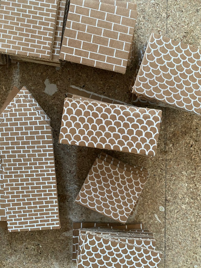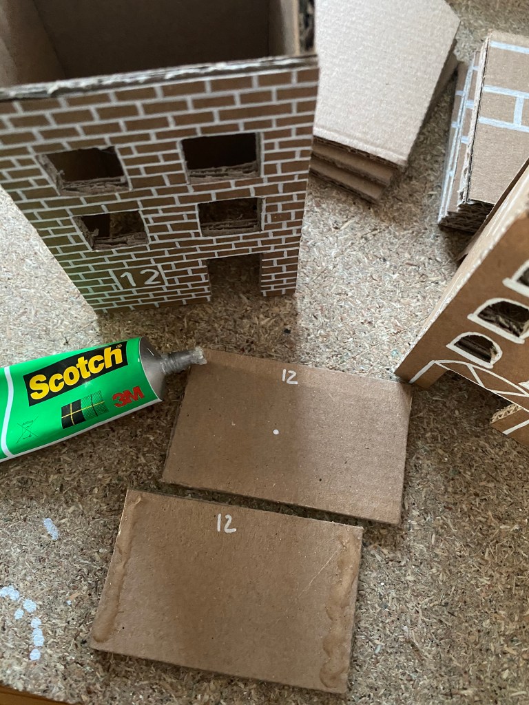 Petite astuce : Pour ne pas s’y perdre lors de l’étape du collage, j’ai inscrit le numéro des maisons derrière chaque côté et pans de toit. L’étape du collage n’en sera que plus simple et plus rapide.