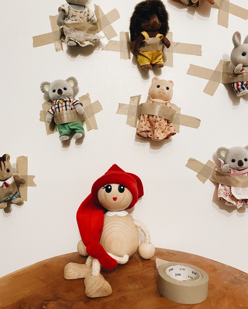 Dans la chambre, Elka a rendu complice pas mal de jouets des enfants dans ses bêtises : elle a fait une course en sac avec les Sylvanian mais les a aussi scotché au mur. Elle a réalisé une chorale de noël avec les Playmobil et a fait une partie de jeu de société avec les doudous. Elle a tenté de manger un personnage de la reine des neiges en le mettant entre deux toast au petit déjeuner et elle a failli se faire manger par les dinosaures Schleich. Enfin cette petite coquine s’est faufilée dans le sac d’école des enfants.