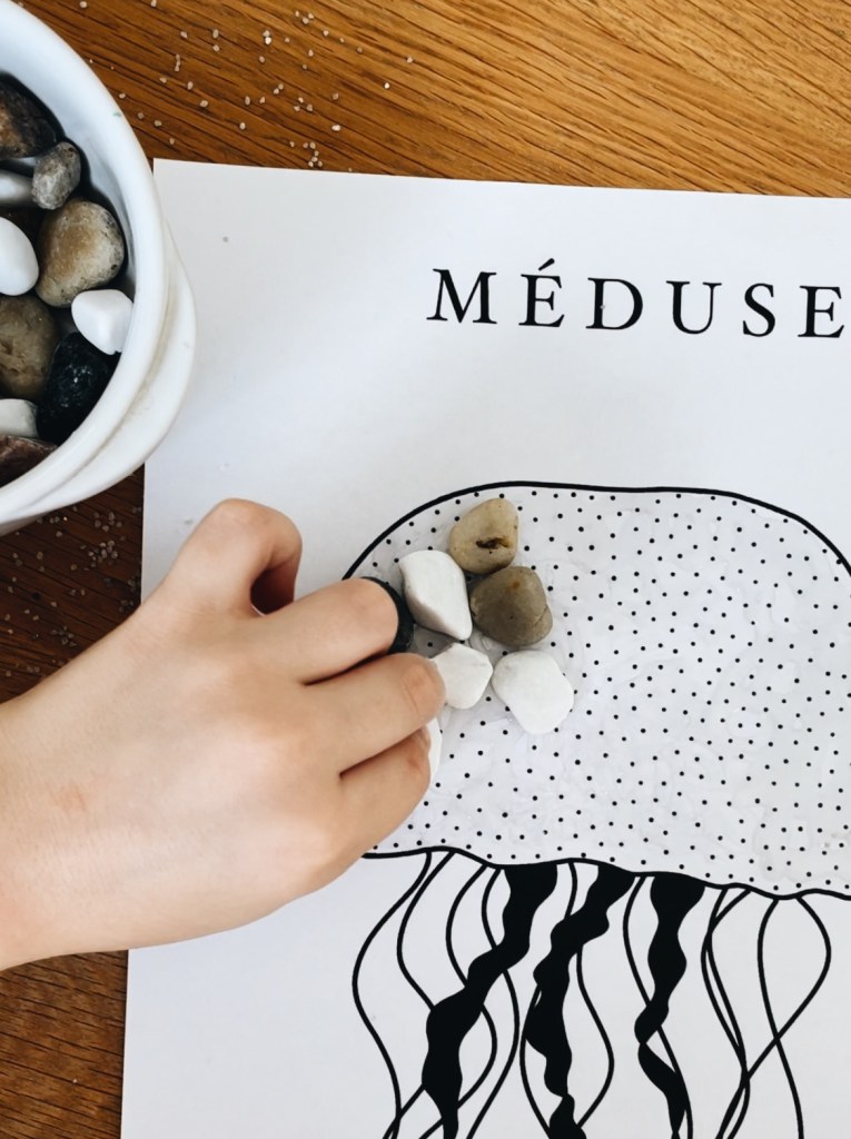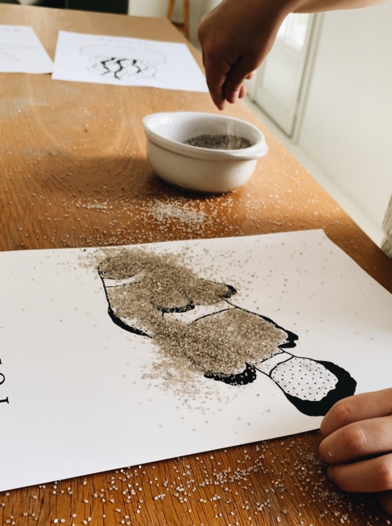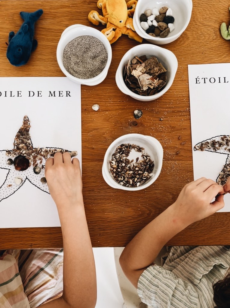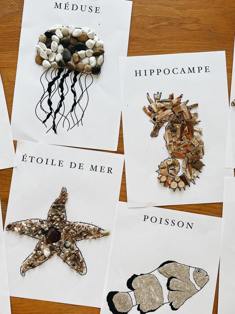 Les nouveaux animaux de saison. Les points délimitent les zones à décorer. De sable, de petits galets, de coquillages, de feuilles, d’écorces ou de brindilles…